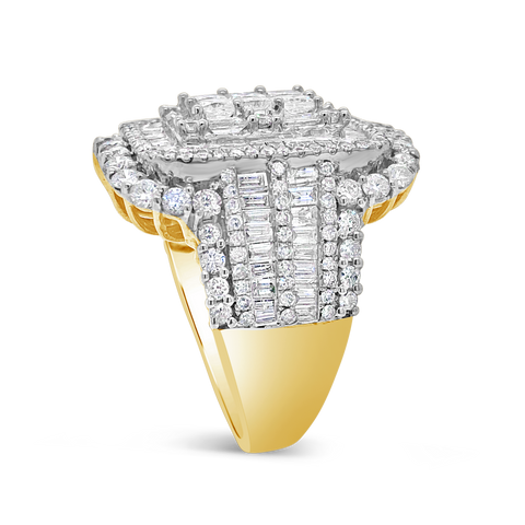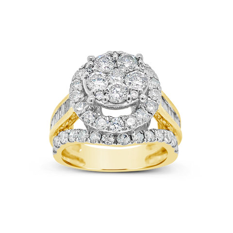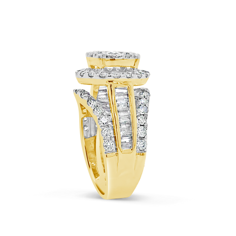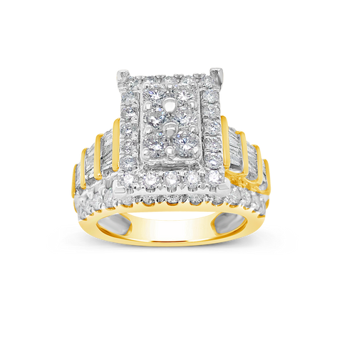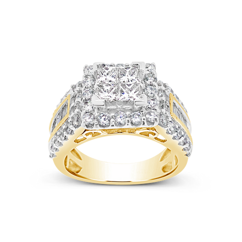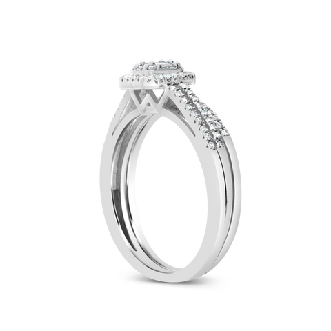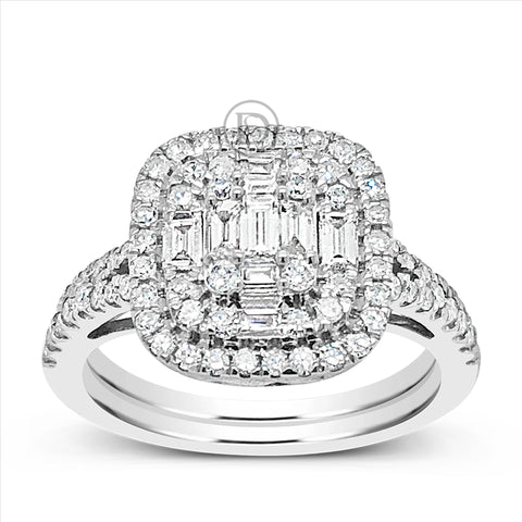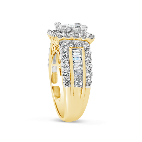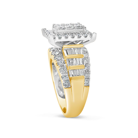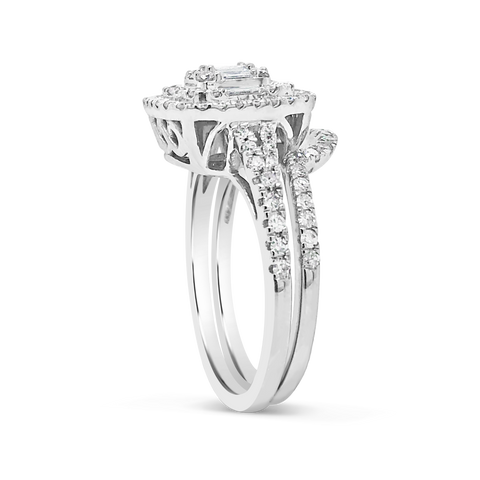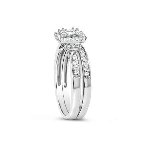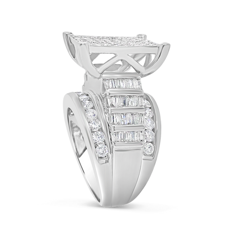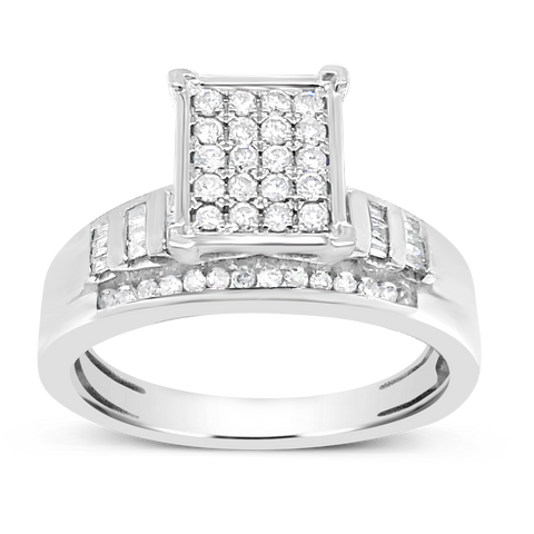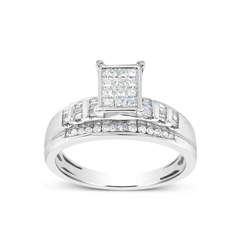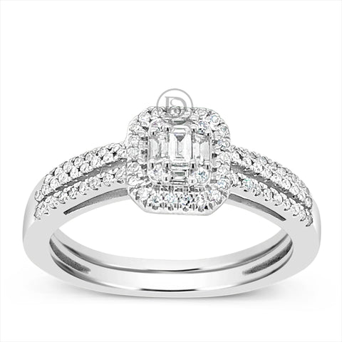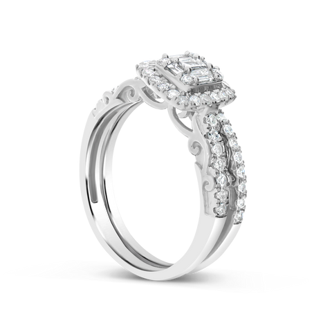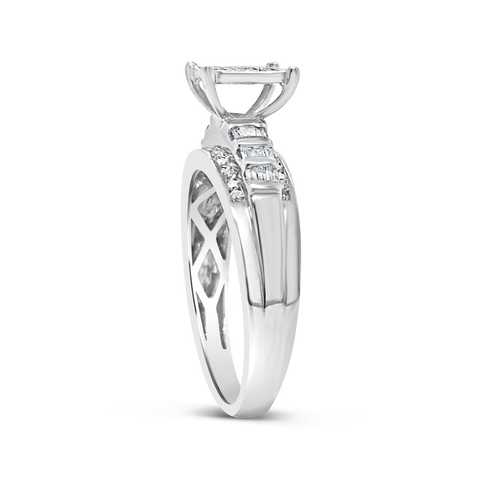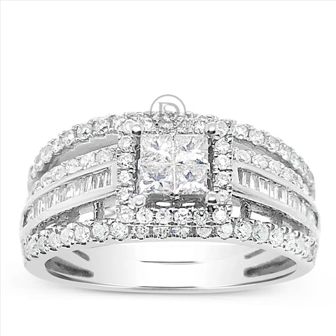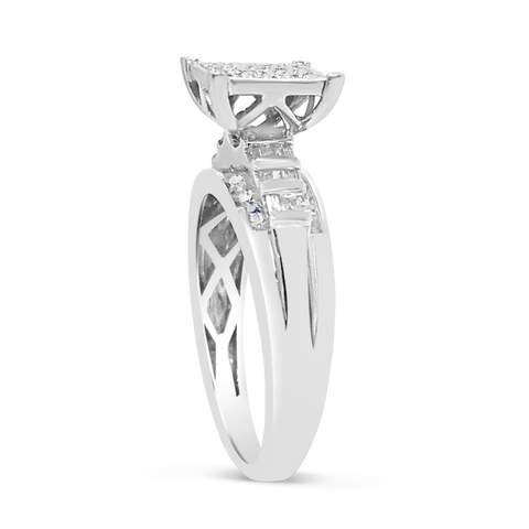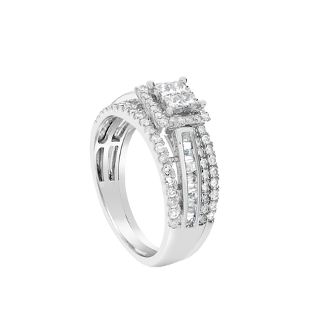Make your special moment unforgettable with the stunning Diamond Engagement Ring in 10K White Gold. This exquisite ring features .50 CTW center diamonds that shimmer with brilliant radiance, surrounded by a breathtaking combination of princess and round-cut diamonds, as well as baguettes. The striking combination of princess and round cut diamonds in the center of the ring creates a captivating effect, drawing attention to the beauty and sparkle of the stones. This ring's striking beauty and elegant design make it a precious and unforgettable symbol of enduring love that will be treasured for years to come.