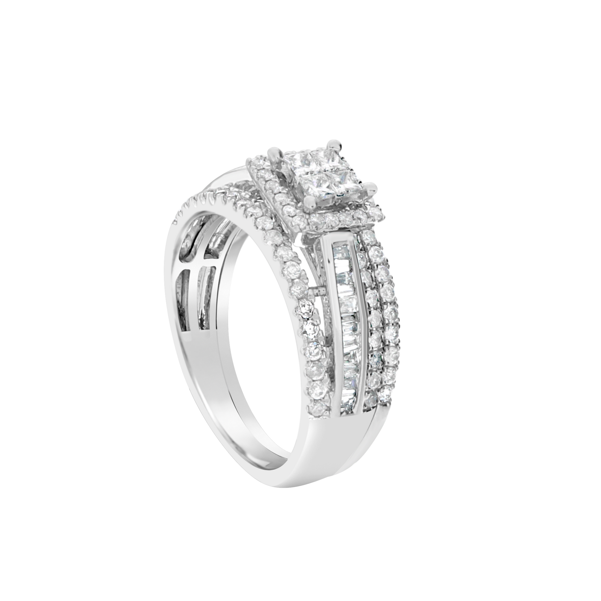 The 14K White Gold band also includes Baguette diamonds, which complement the stunning centerpiece and enhance the overall beauty and uniqueness of the ring. The Princess Cut diamond has been chosen for its exceptional clarity and brilliance, while the Round Cut and Baguette diamonds set into the band create a stunning contrast and add to the overall elegance of the ring. This .95-carat Diamond Halo ring is a unique and glamorous engagement ring that she will love and cherish forever.