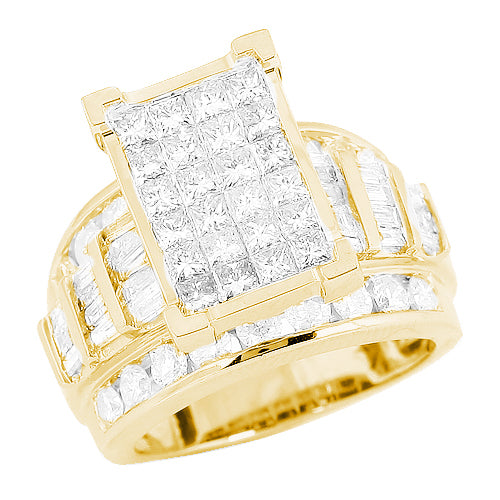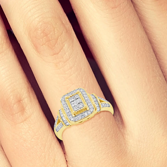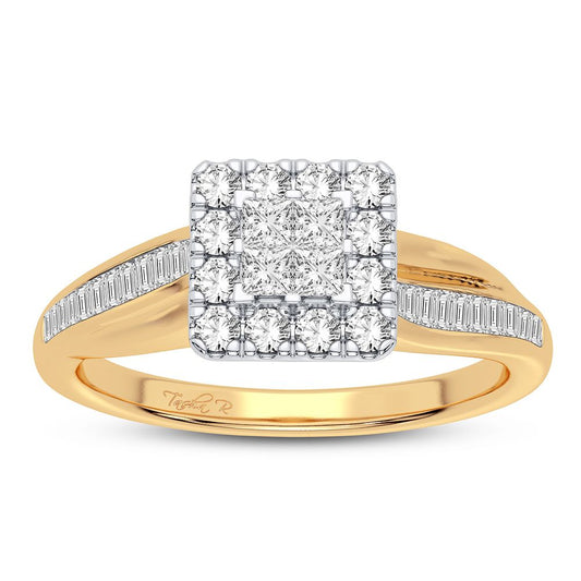 • Diamond Halo Engagement Ring .93 CTW Princess Cut w/ Baguettes & Round Cut 14K Yellow Gold Diamond Halo Engagement Ring .93 CTW Princess Cut w/ Baguettes & Round Cut 14K Yellow Gold