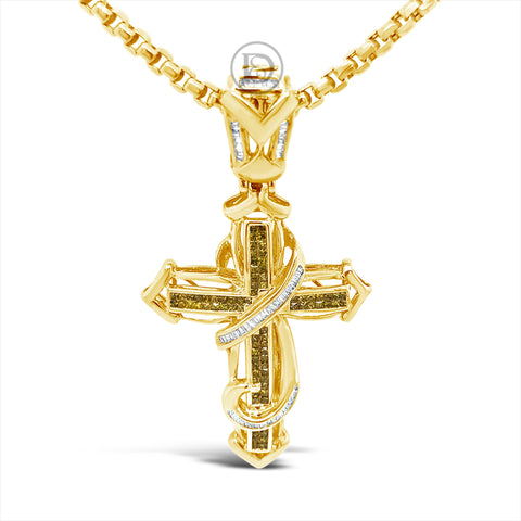 Yellow Diamond Cross Pendant 3.08 CTW Princess & Round Cut w/ Baguettes 14K Yellow Gold