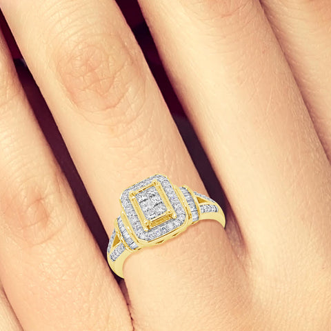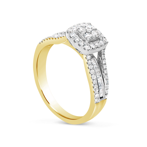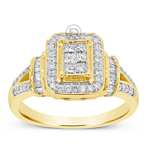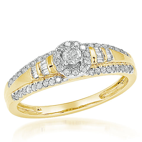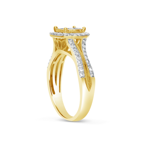 • Diamond halo engagement ring .50 ctw round w/ baguette cut 10k yellow gold