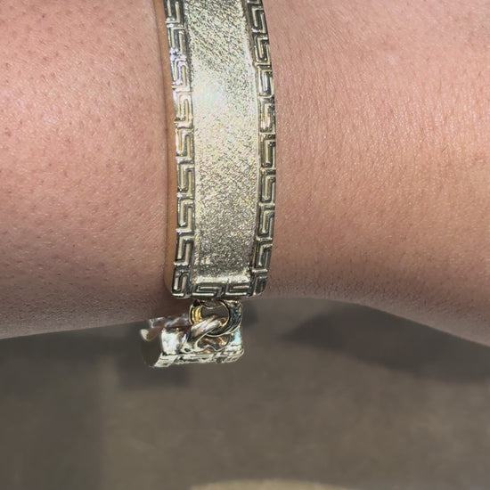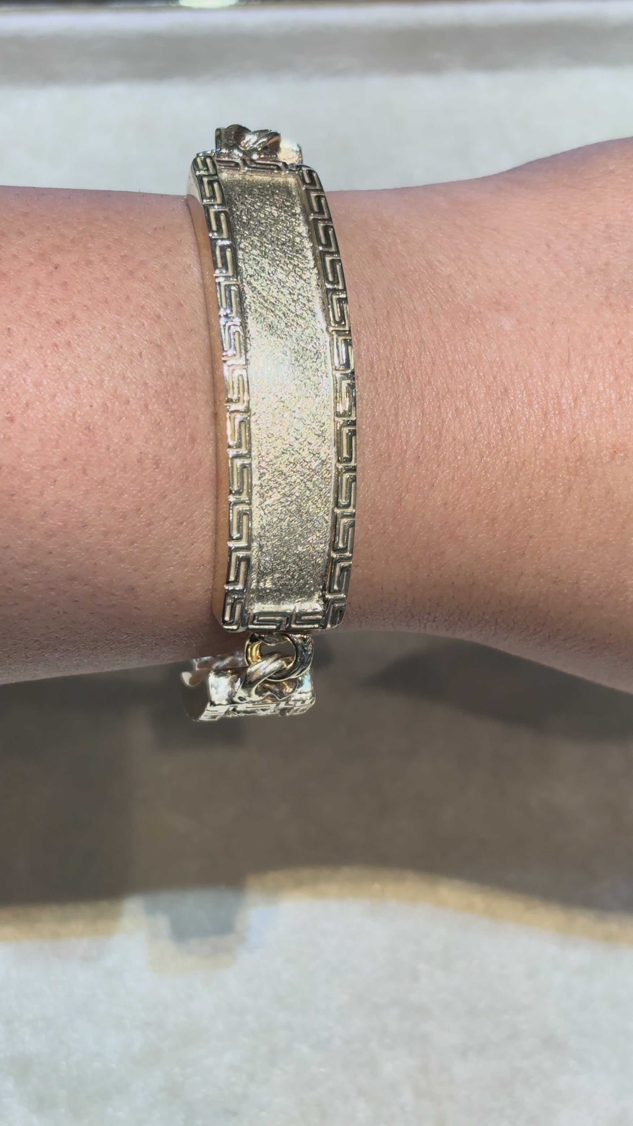 10K 13MM GOLD CHINO LINK BRACELET WITH GREEK KEY BORDER AND DUAL ST. JUDE ID PLATES. PERFECTLY STYLISH, MEANINGFUL AND TIMELESS.