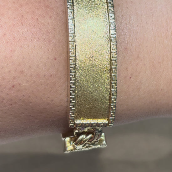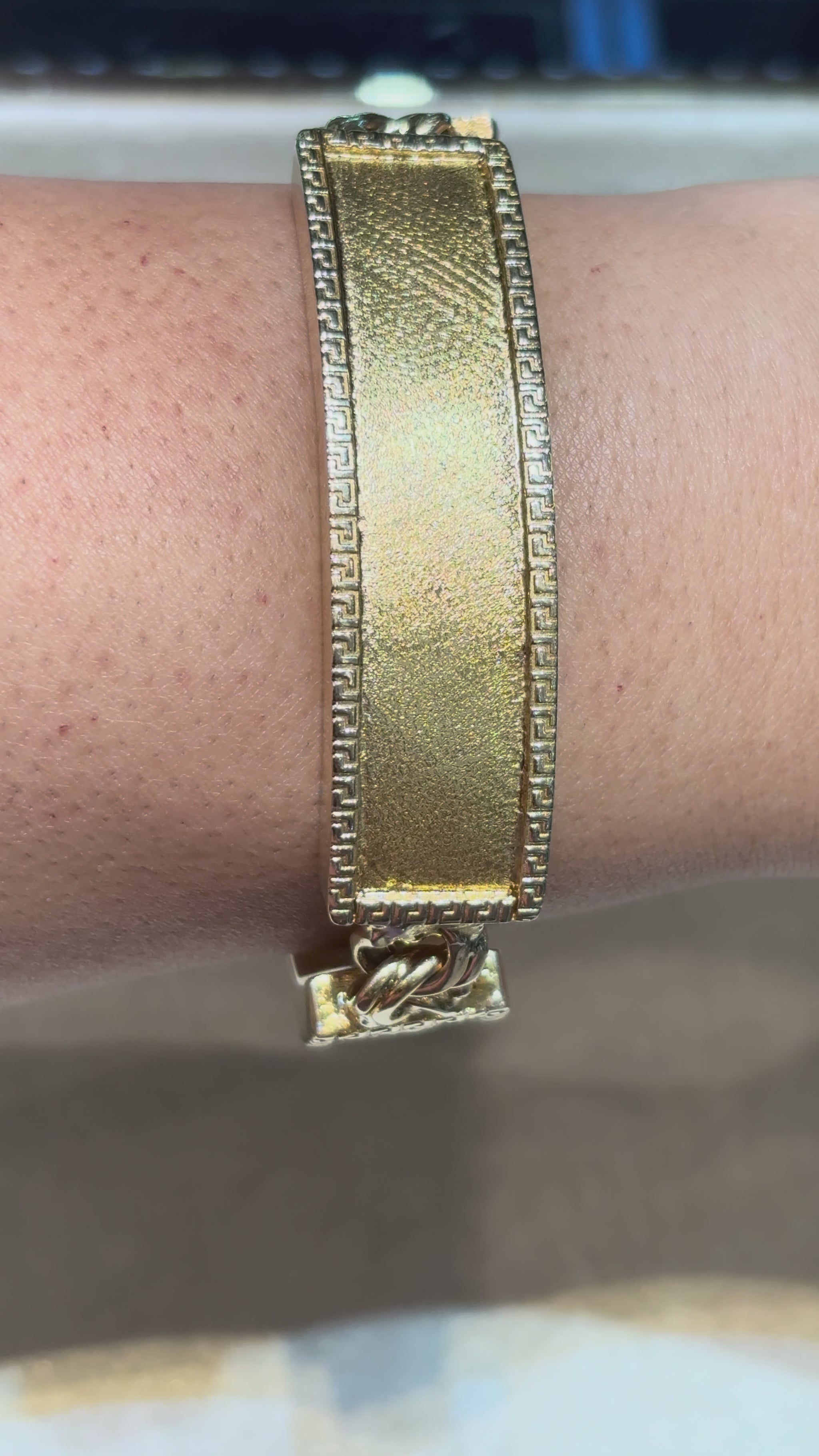10K 15MM GOLD CHINO LINK BRACELET WITH GREEK KEY BORDER AND DUAL ST. JUDE ID PLATES. PERFECTLY STYLISH, MEANINGFUL, AND TIMELESS.