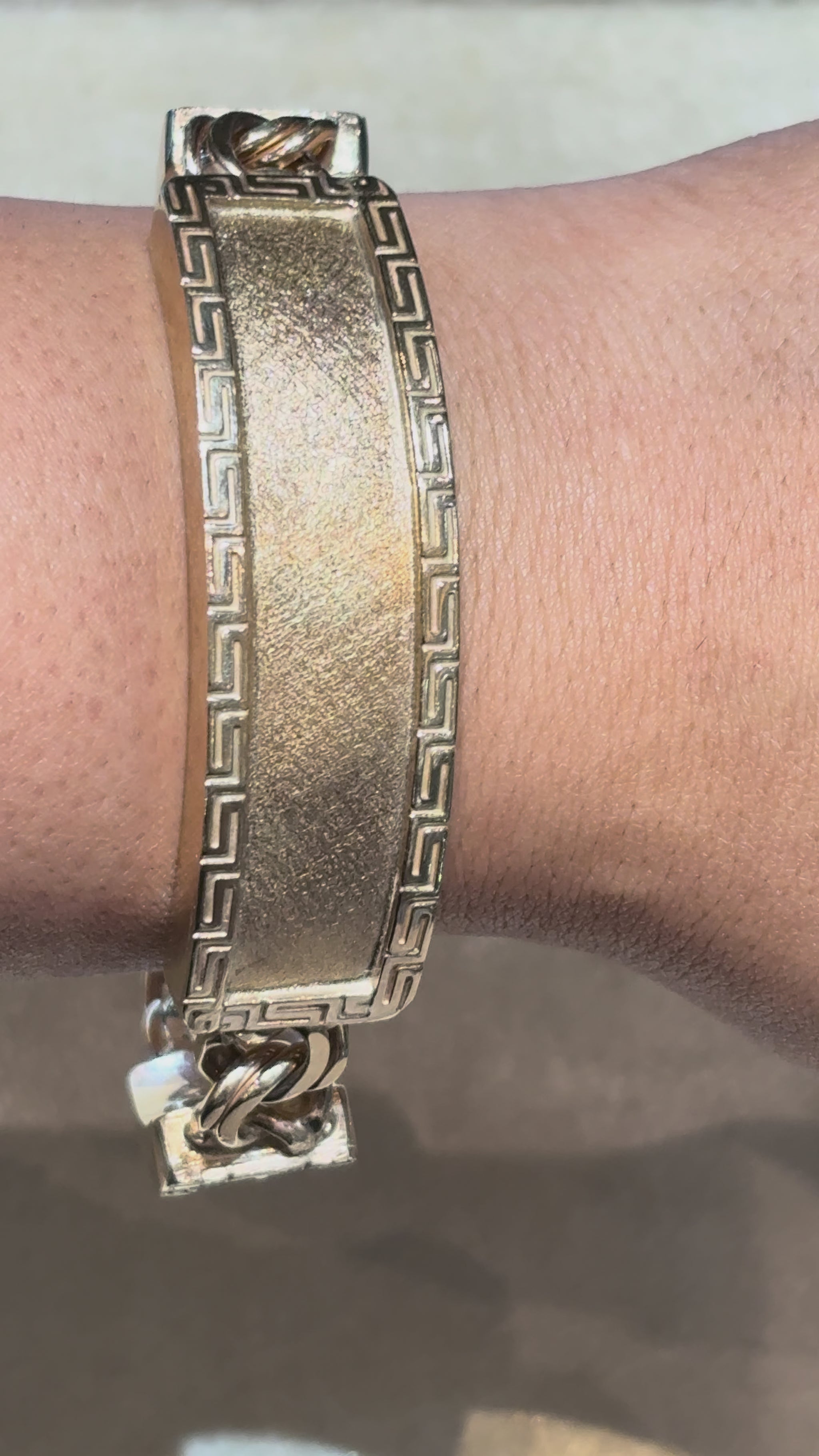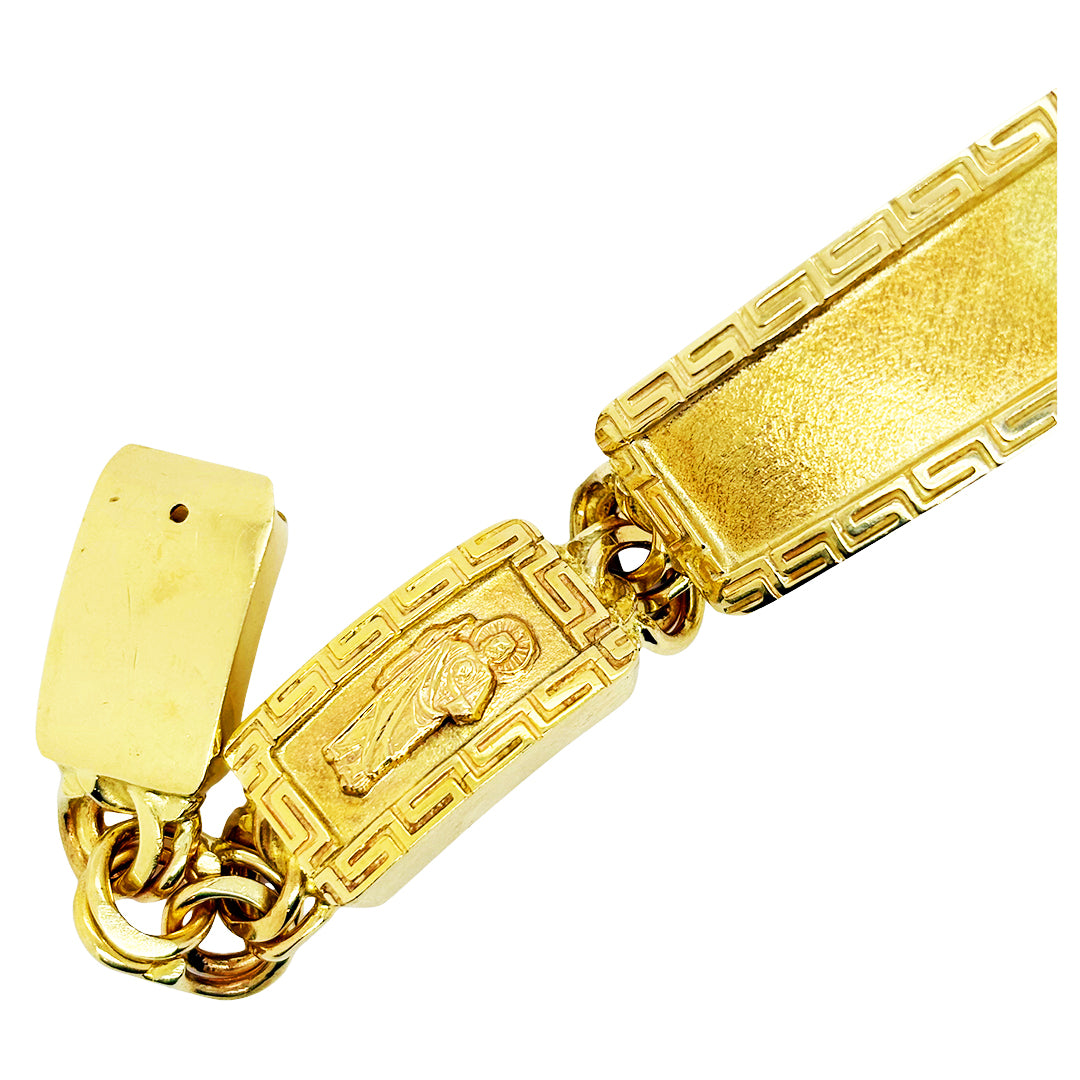 CHINO BRACELET WITH ST. JUDE ON TWO PLATES AND GREEK KEY BORDER ON ALL THREE PLATES, CENTER PLATE PLAIN 77.40 GM