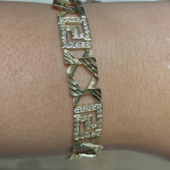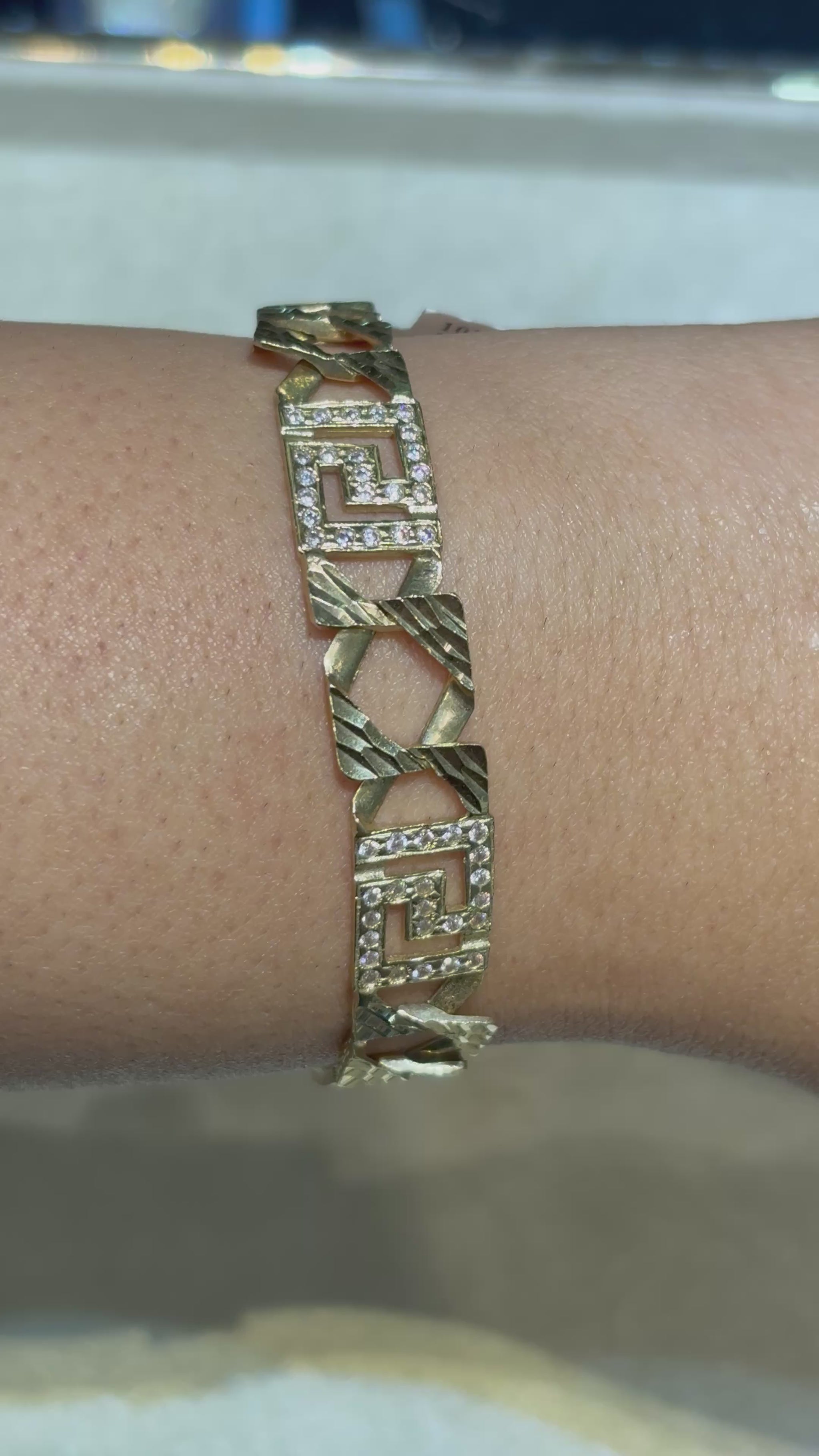 10K 10MM gold bracelet featuring an . Greek key link design accented with sparkling cz stones. Crafted in yellow gold with a diamond-cut and polished finish, this luxury bracelet offers timeless sophistication and shine.