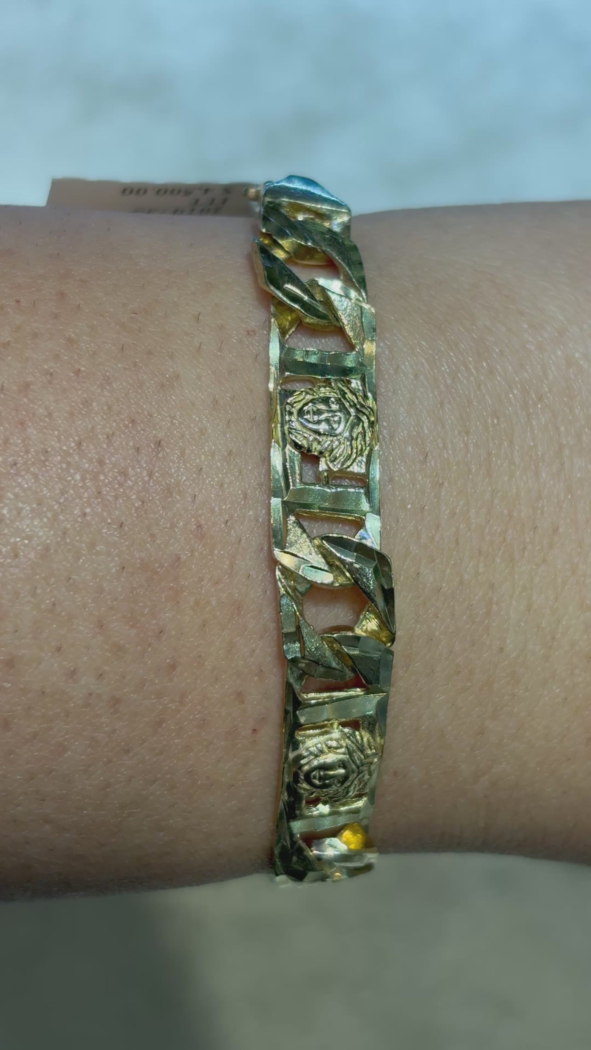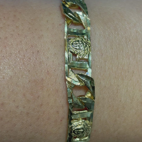 10K 8MM gold bracelet featuring an . Medusa head link design in yellow gold. Crafted with diamond-cut detailing and a polished finish, this luxury bracelet offers a bold and sophisticated statement.