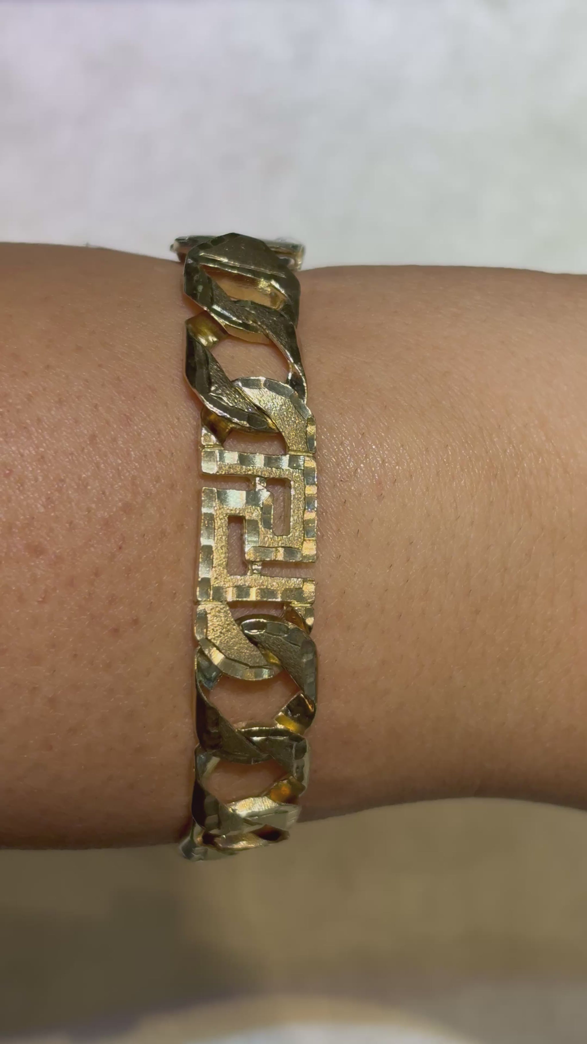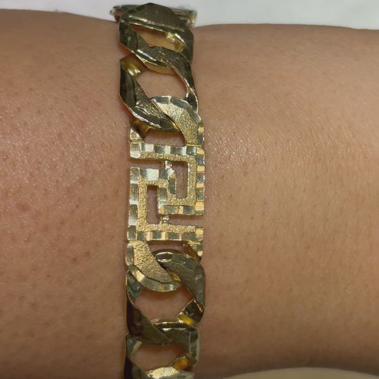 10K GOLD 11MM GREEK KEY CUBAN BRACELET FEATURES A BOLD MIX OF CUBAN LINK AND DETAILED GREEK KEY DESIGN PLATES, ALL CRAFED IN GENUINE YELLOW GOLD. WITH ITS POLISHED TEXTURE AND CLASSIC PATTERN, THIS BRACELET IS A STANDOUT ACCESSORY IN MEN'S JEWELRY-PERFECT FOR EVERYDAY WEAR OR GIFTING.