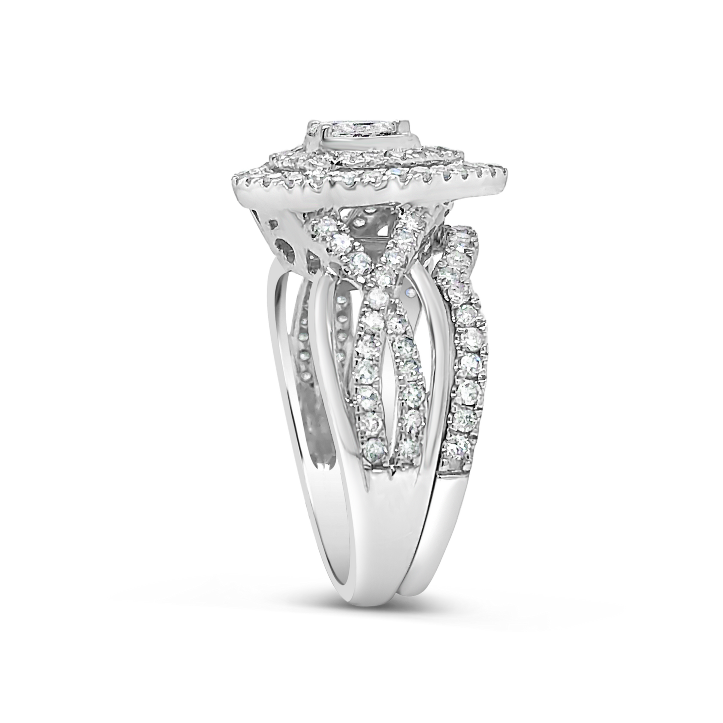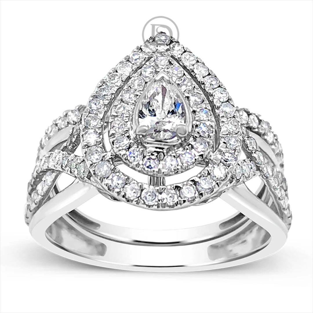 This magnificent Diamond Halo Pear-Shaped Engagement Ring captures the essence of true love. The spectacular diamonds, weighing in at .75 carats, are the centerpiece of this exquisite ring. A halo of round-cut diamonds adds even more sparkle to this beautiful item and perfectly balances its brilliance. The diamonds contrast sharply with the band's fine 14K white gold construction, giving the piece a classic and refined appearance. The round-cut diamonds set along the band add even more brilliance, making this ring a true showstopper.