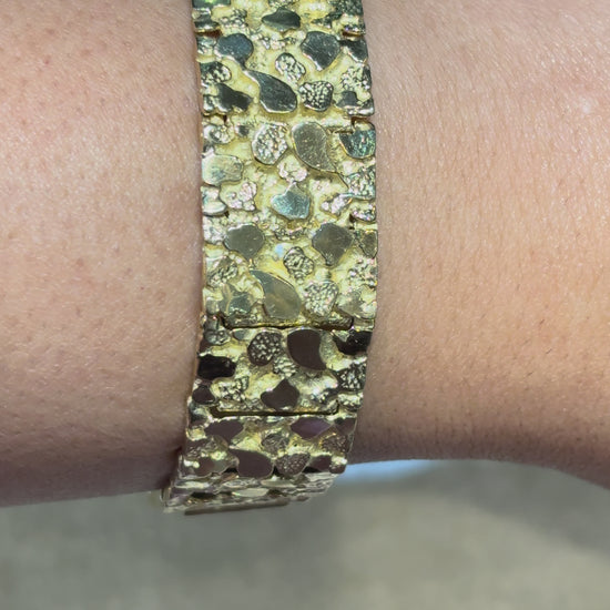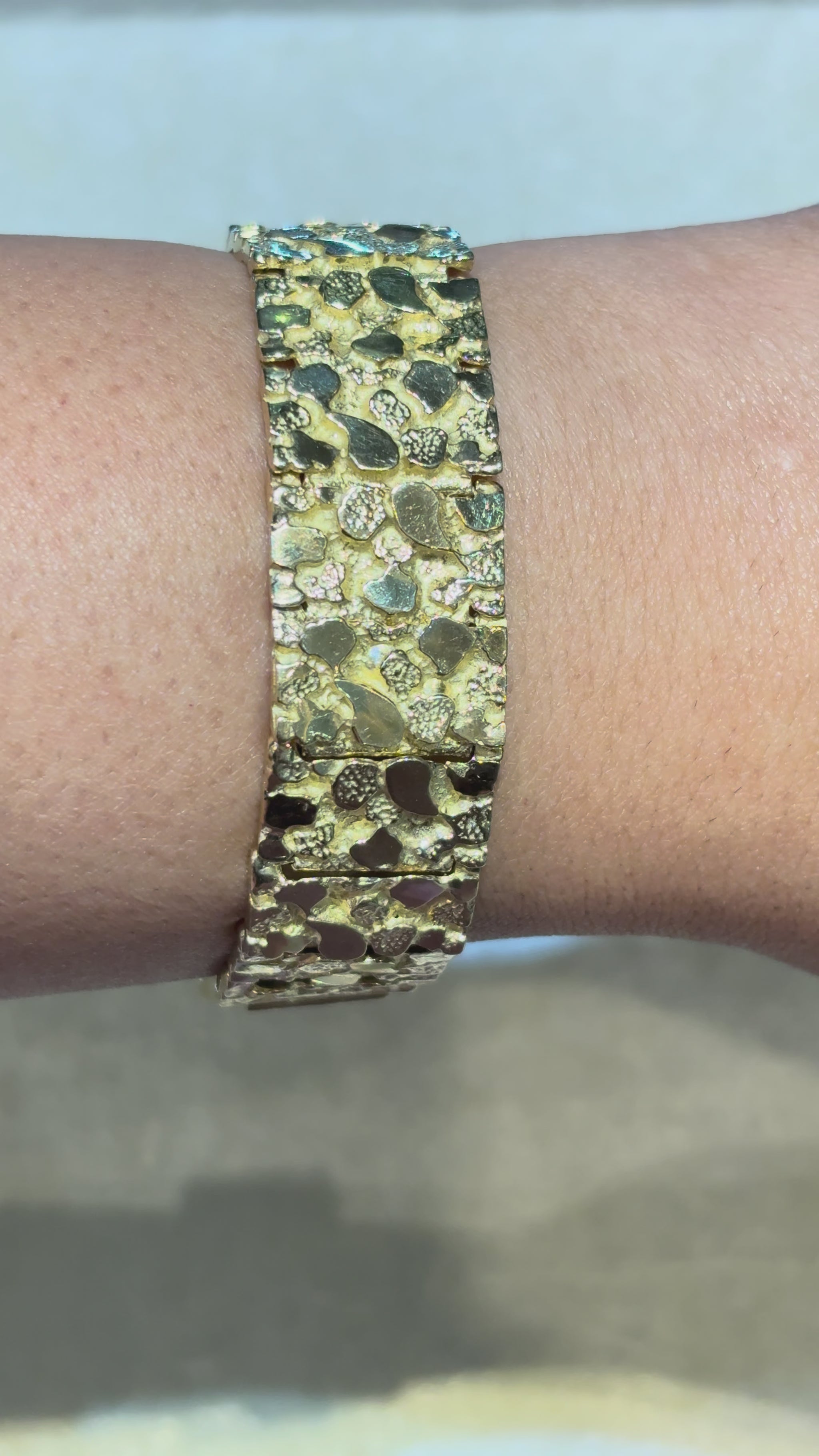 10K 17MM GOLD NUGGET BRACELET SHOWCASES BOLD STYLE AND TIMELESS CRAFTMANSHIP. THIS PIECE FEATURES CASSIC YELLOW GOLD NUGGET DETAILING FOR A REFINED LOOK. EVERYDAY WEAR OR SPECIAL OCCASIONS, THIS BRACELET MAKES A POWERFUL STATEMENT.
