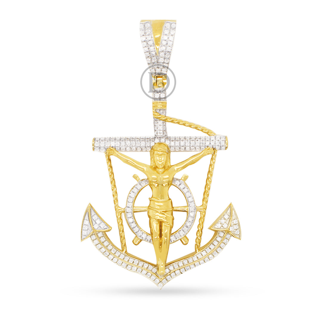Set sail on a style journey with the 10K yellow gold Anchor pendant with 0.53ct diamonds. Crafted from high-quality 10K yellow gold, this pendant showcases a stunning 0.53 CTW of diamonds that shimmer with every movement. The anchor design is intricately detailed, with a classic and timeless shape that symbolizes hope, stability, and strength.