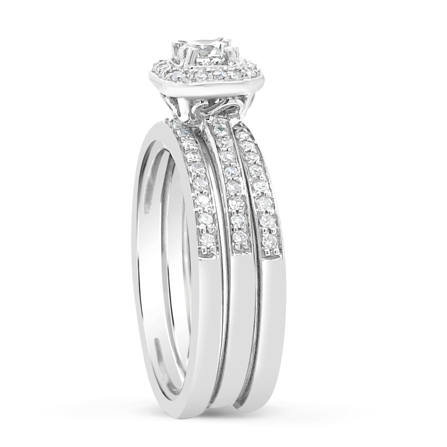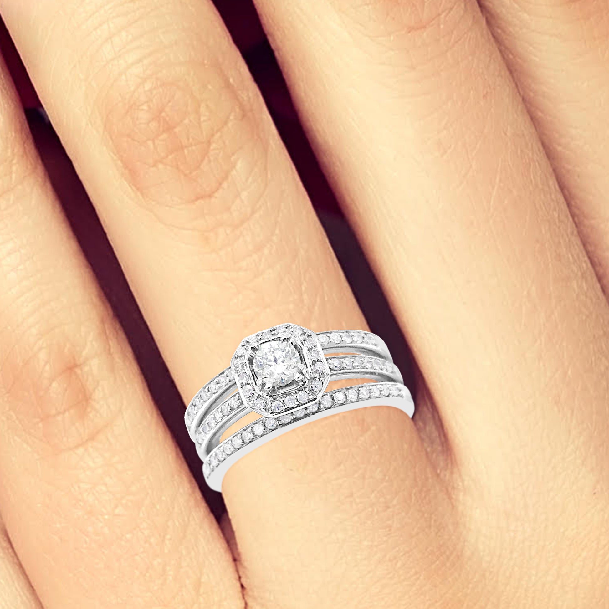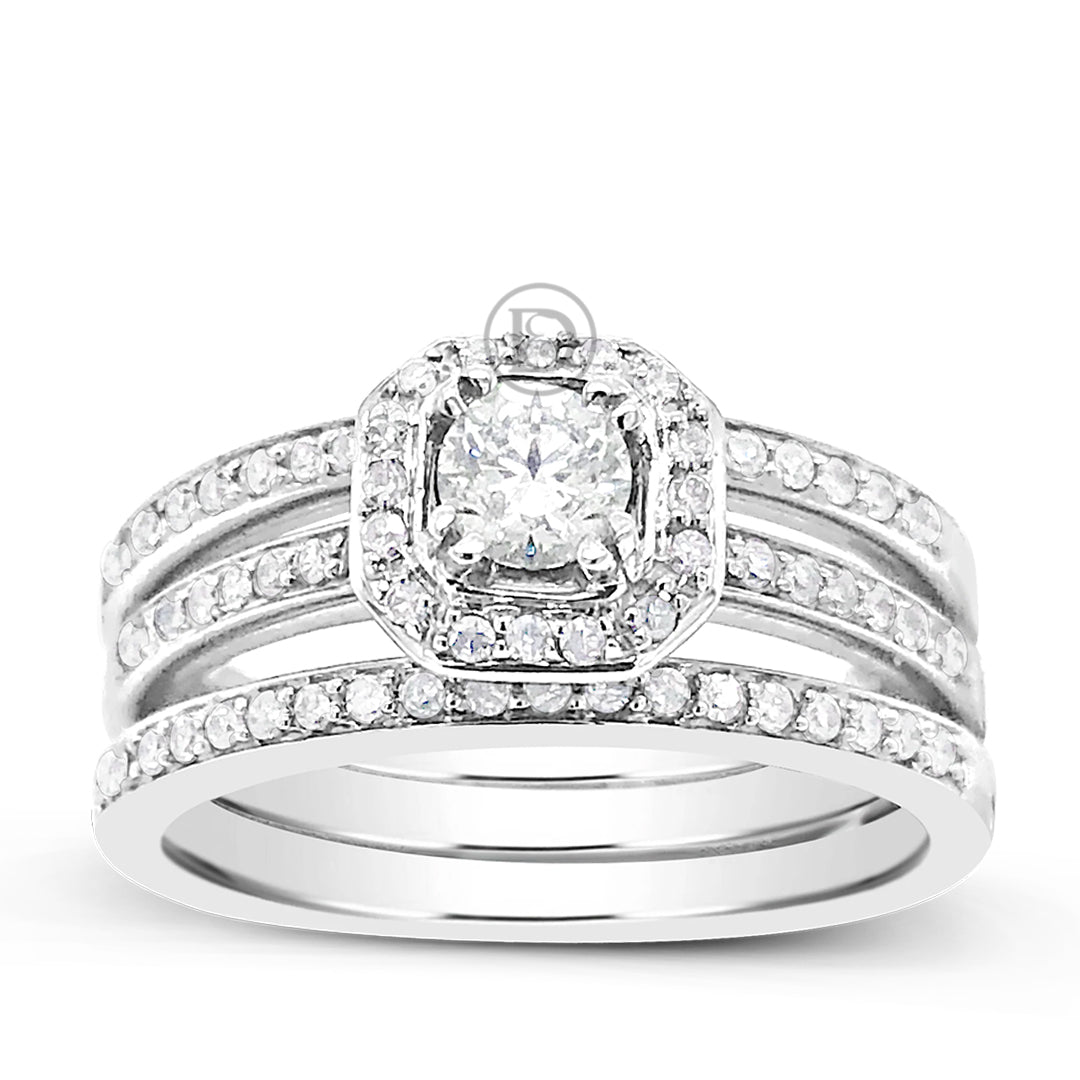 3 Band Diamond Halo Engagement Ring .62 CTW Round Cut 14K White Gold
