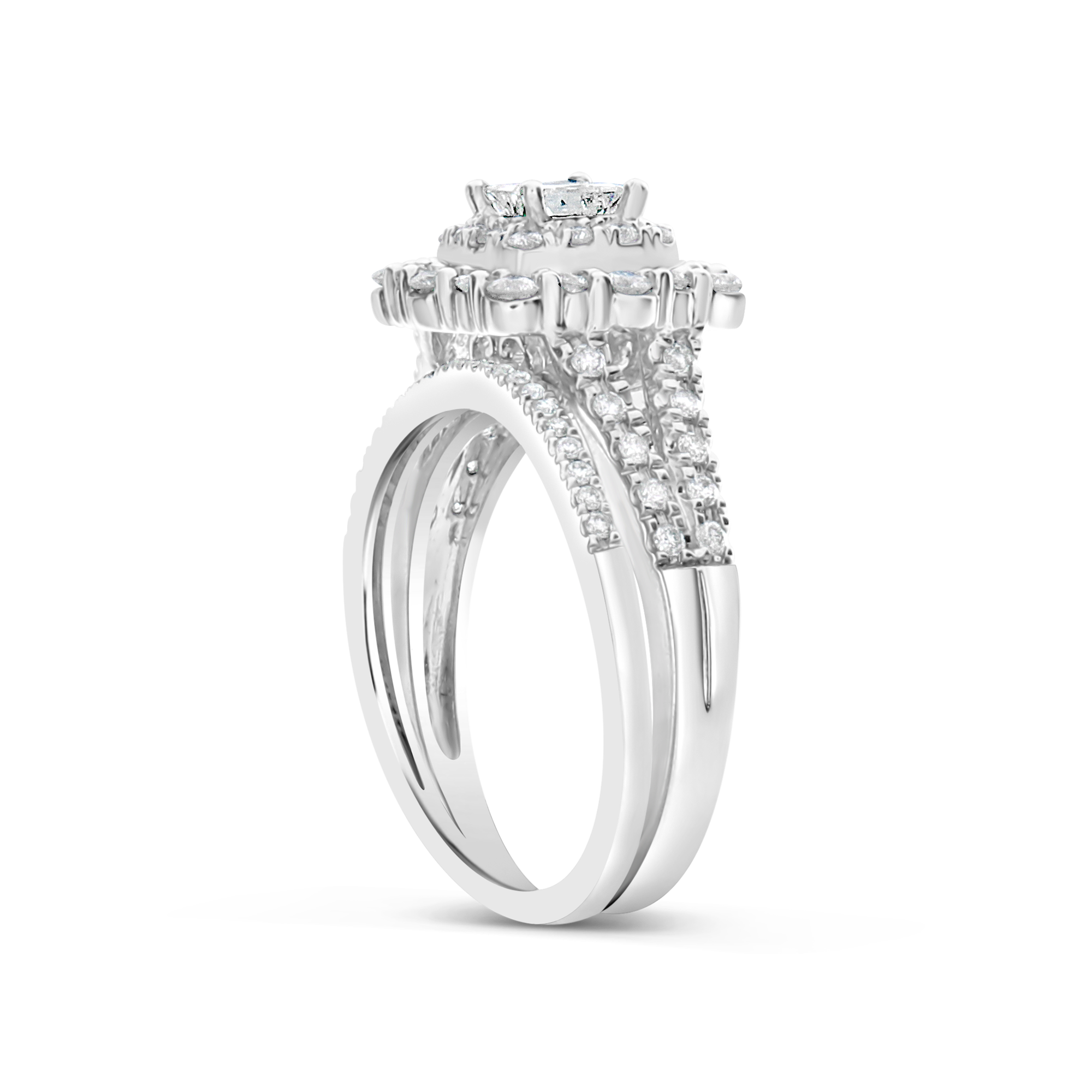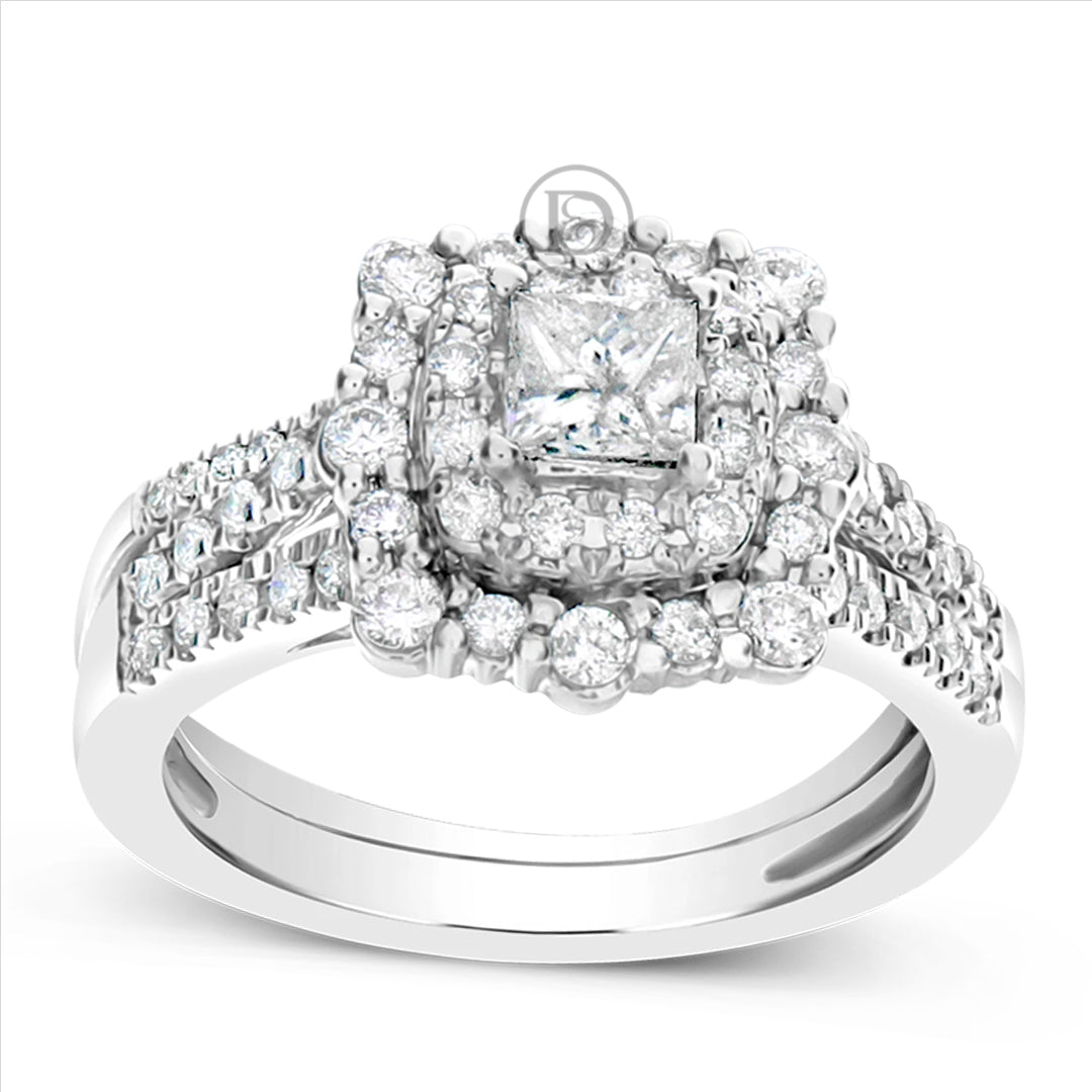 Celebrate your love with our exquisite 3-Ring Diamond Halo Engagement Ring, a breathtaking piece that will leave her speechless. This ring is the perfect combination of timeless elegance and modern sophistication, featuring 1.50 carats of diamonds set in 14K White Gold. The center diamonds are stunning Round Cut diamonds, weighing 0.75 carats, surrounded by a halo of sparkling smaller diamonds. Baguette diamonds, weighing a total of 0.50 carats, add a touch of glamour to the ring and perfectly complement the center diamonds. Crafted with precision and attention to detail, this ring is not only beautiful but also durable and long-lasting. It is a symbol of your commitment and love that will stand the test of time.