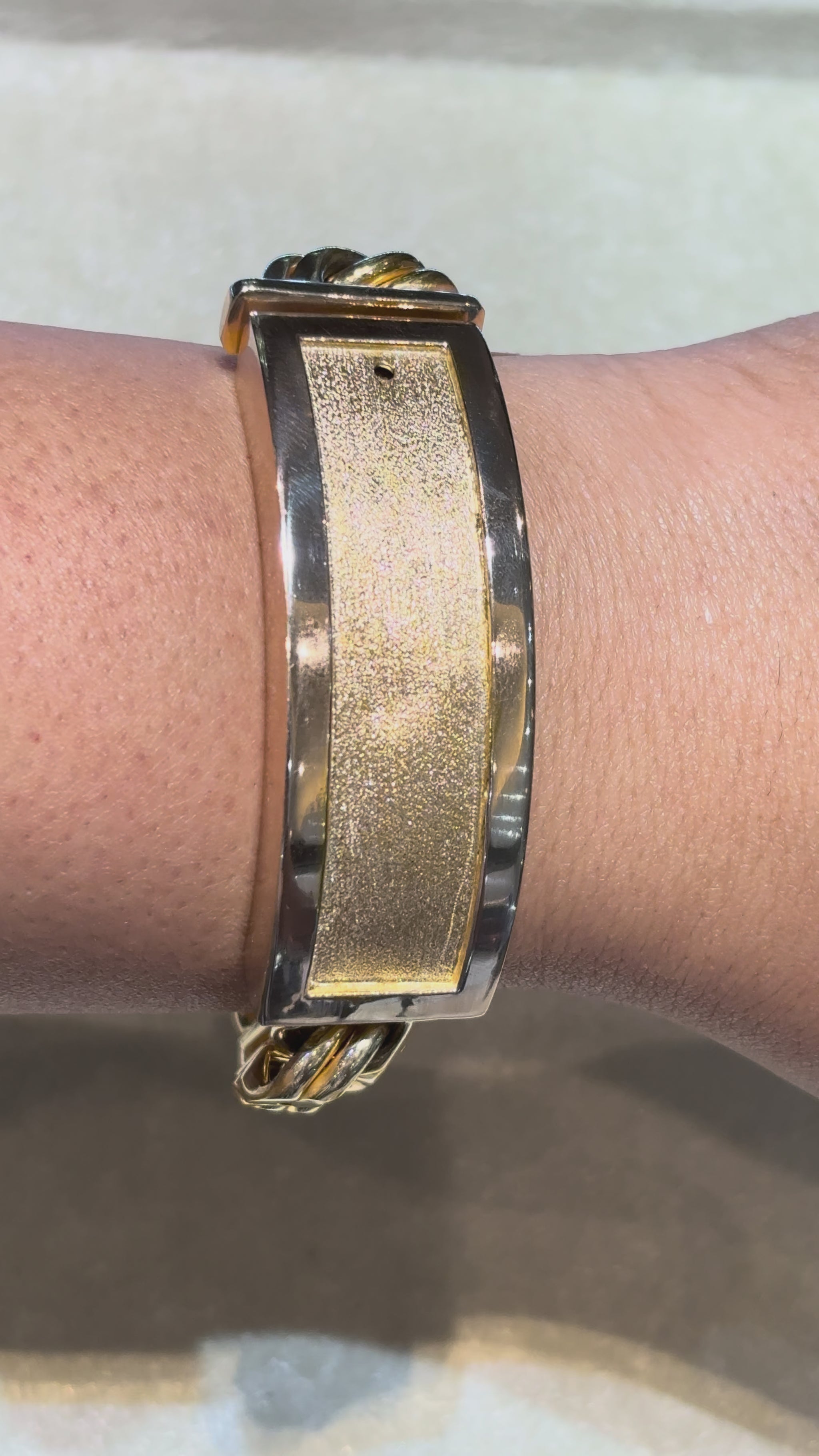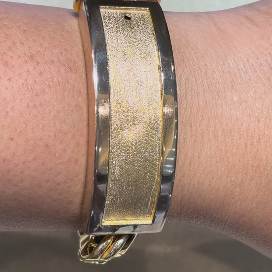 10K 16MM GOLD CHINO LINK BRACELET FEATURING A HIGH POLISH BORDER AND SATIN FINISH ID PLATE. A STYLISH AND TIMELESS GOLD BRACELET FOR EVERYDAY WEAR OR SPECIAL OCCASIONS.
