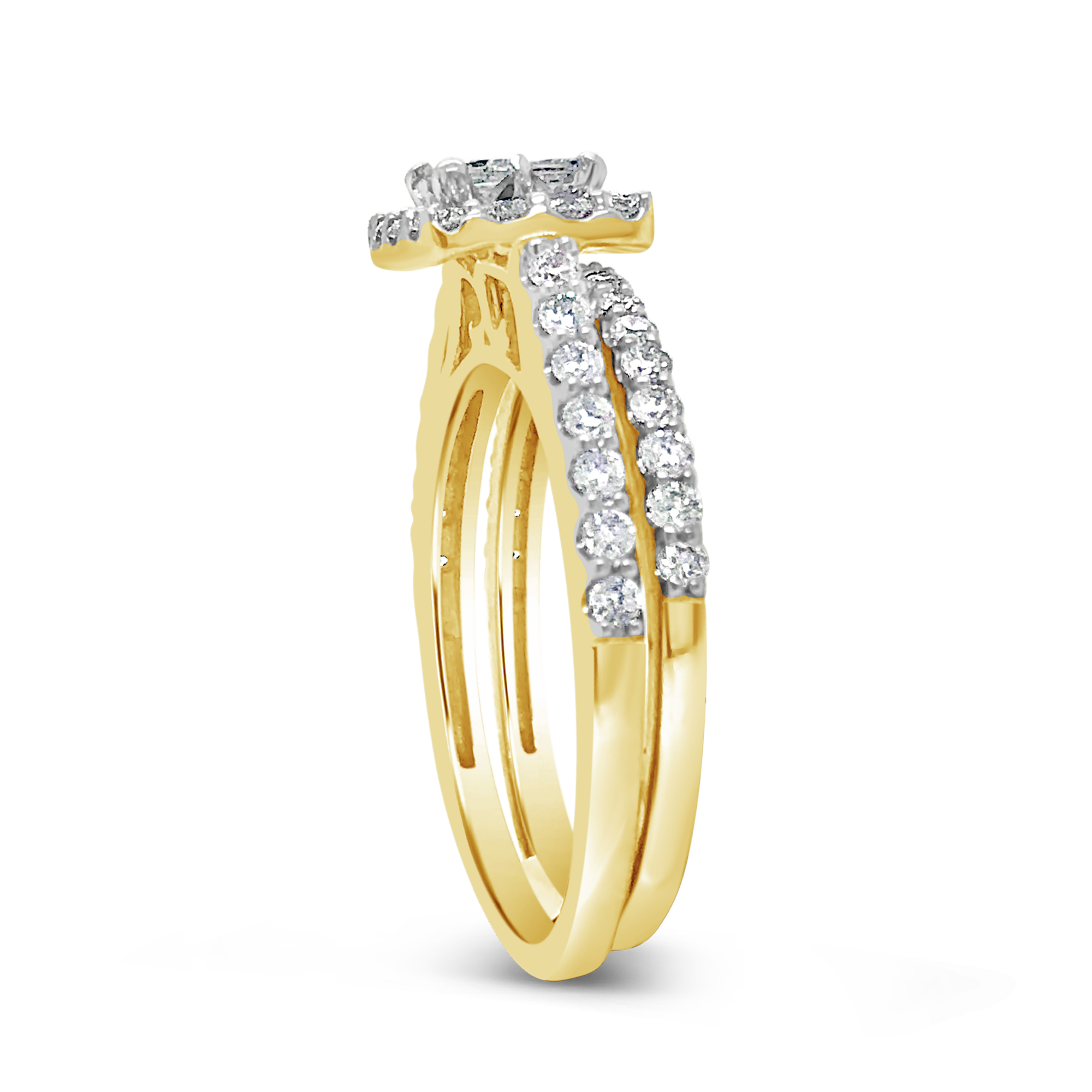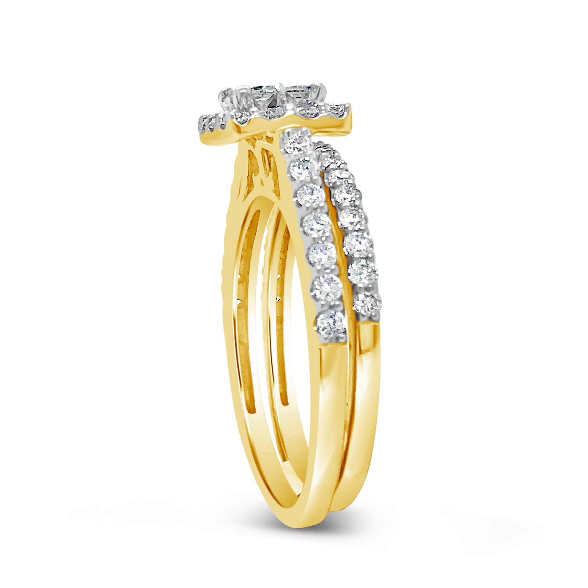 Get ready to make a bold and stunning statement of love with this Diamond Engagement Ring that is set in a luxurious 14K yellow gold bridal set. The ring boasts a total diamond weight of 1 carat, featuring dazzling round cut diamonds that are expertly set to create a magnificent and mesmerizing display of brilliance. The diamonds on the band of the ring are set in a breathtaking pattern that creates a sense of drama and sophistication. Whether you're proposing to your significant other or celebrating an anniversary, this Diamond Engagement Ring is the perfect way to show your love and affection.