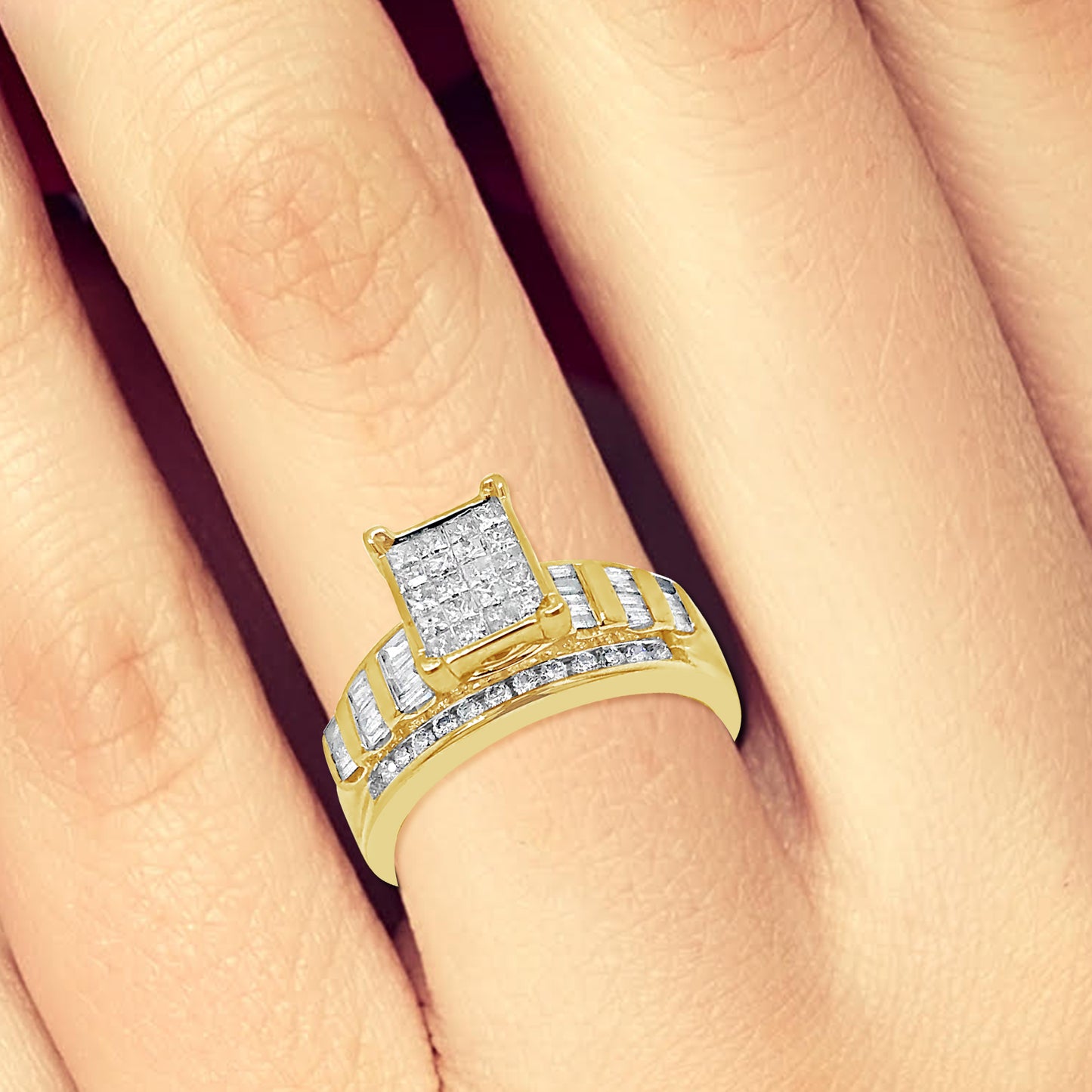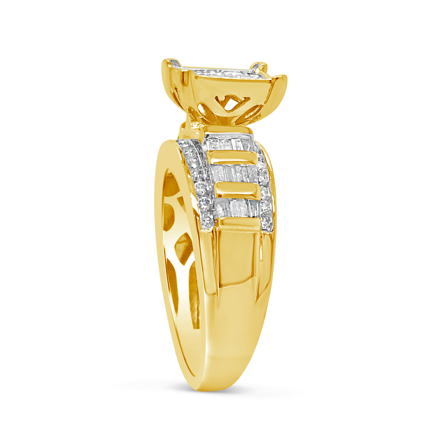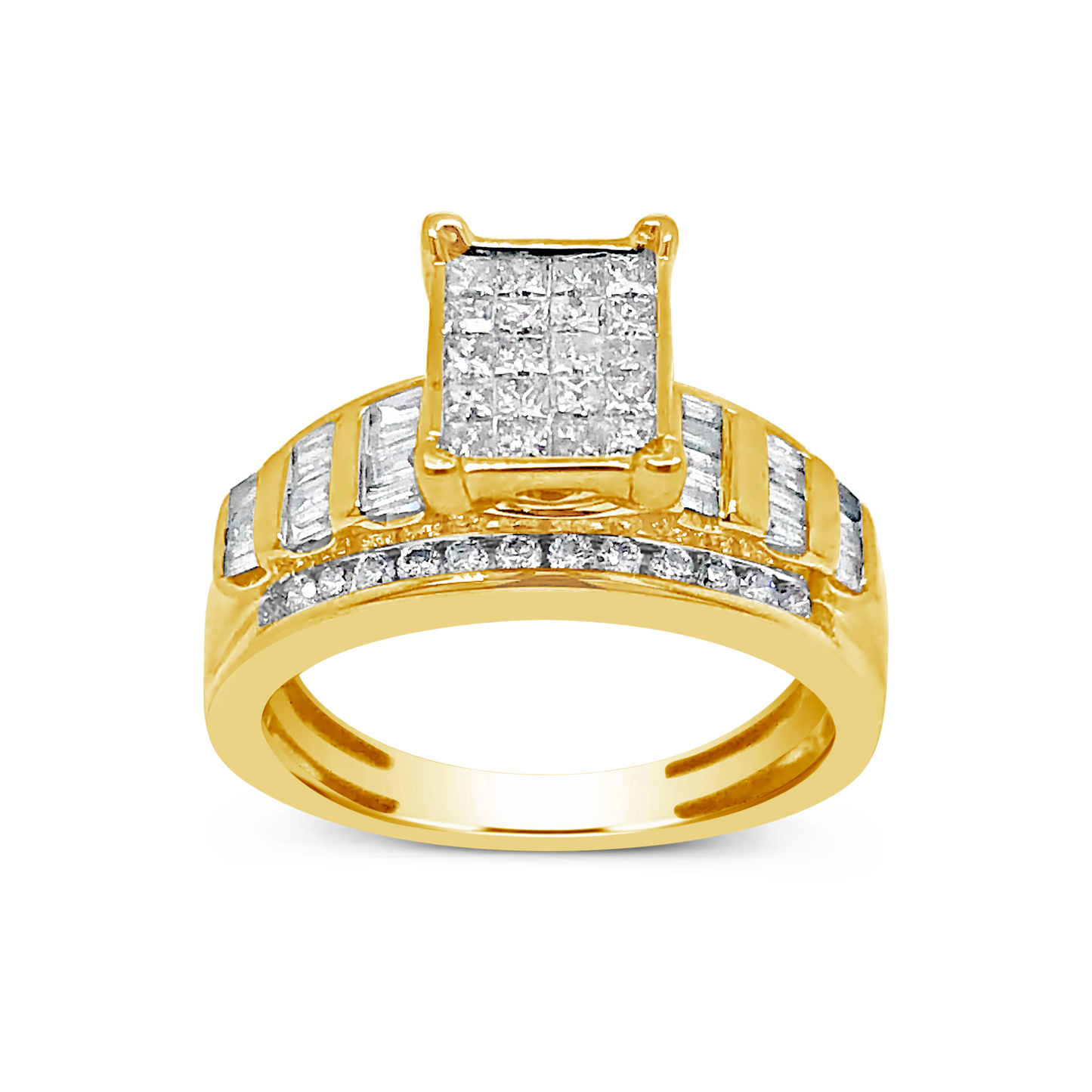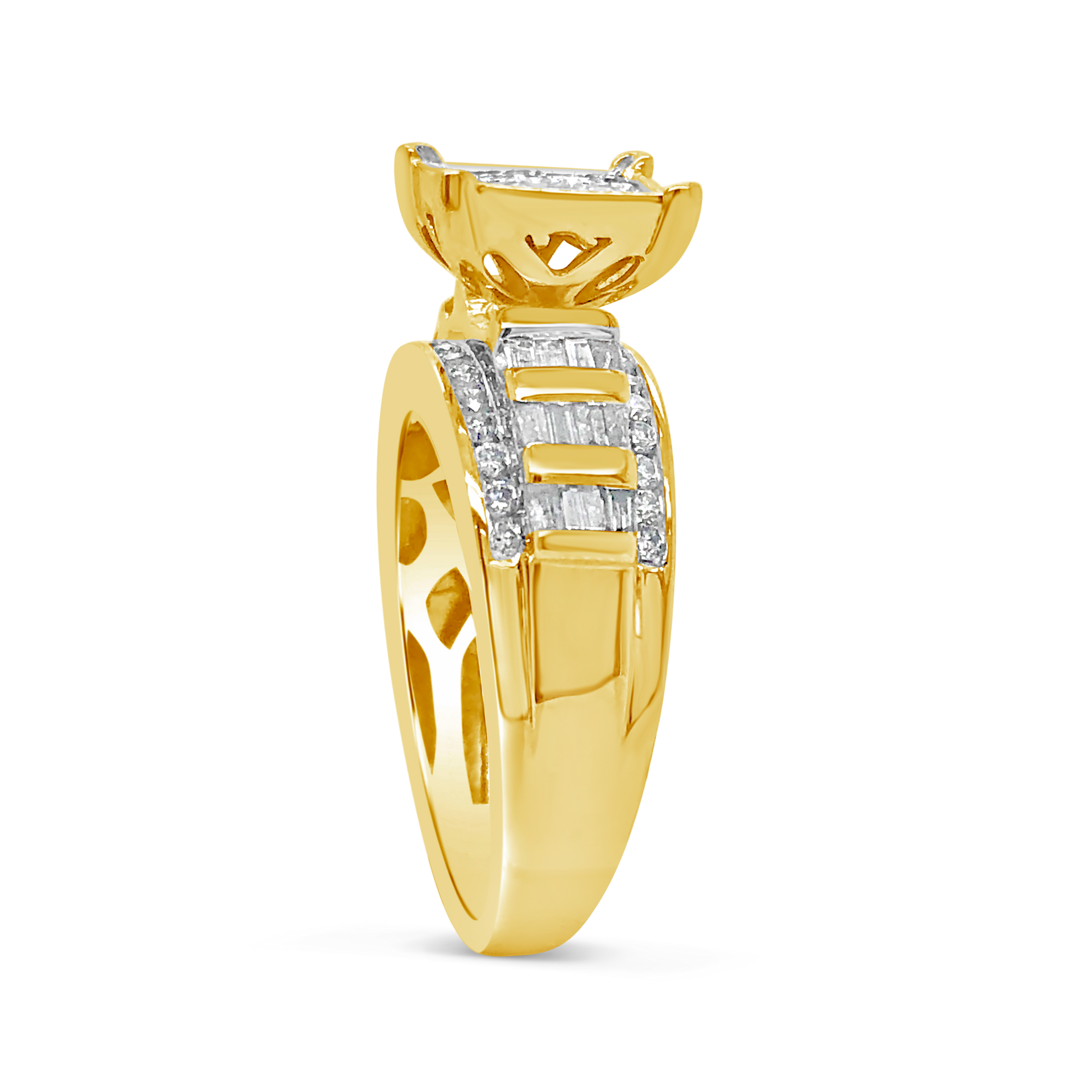 This majestic Diamond Engagement Ring will make a grand and memorable declaration of your love. It has a stunning total weight of 1 carat of the princess and round cut diamonds, accentuated with baguette diamonds. The ring is expertly created in 10K white gold, lending the design a sense of grandeur and elegance.