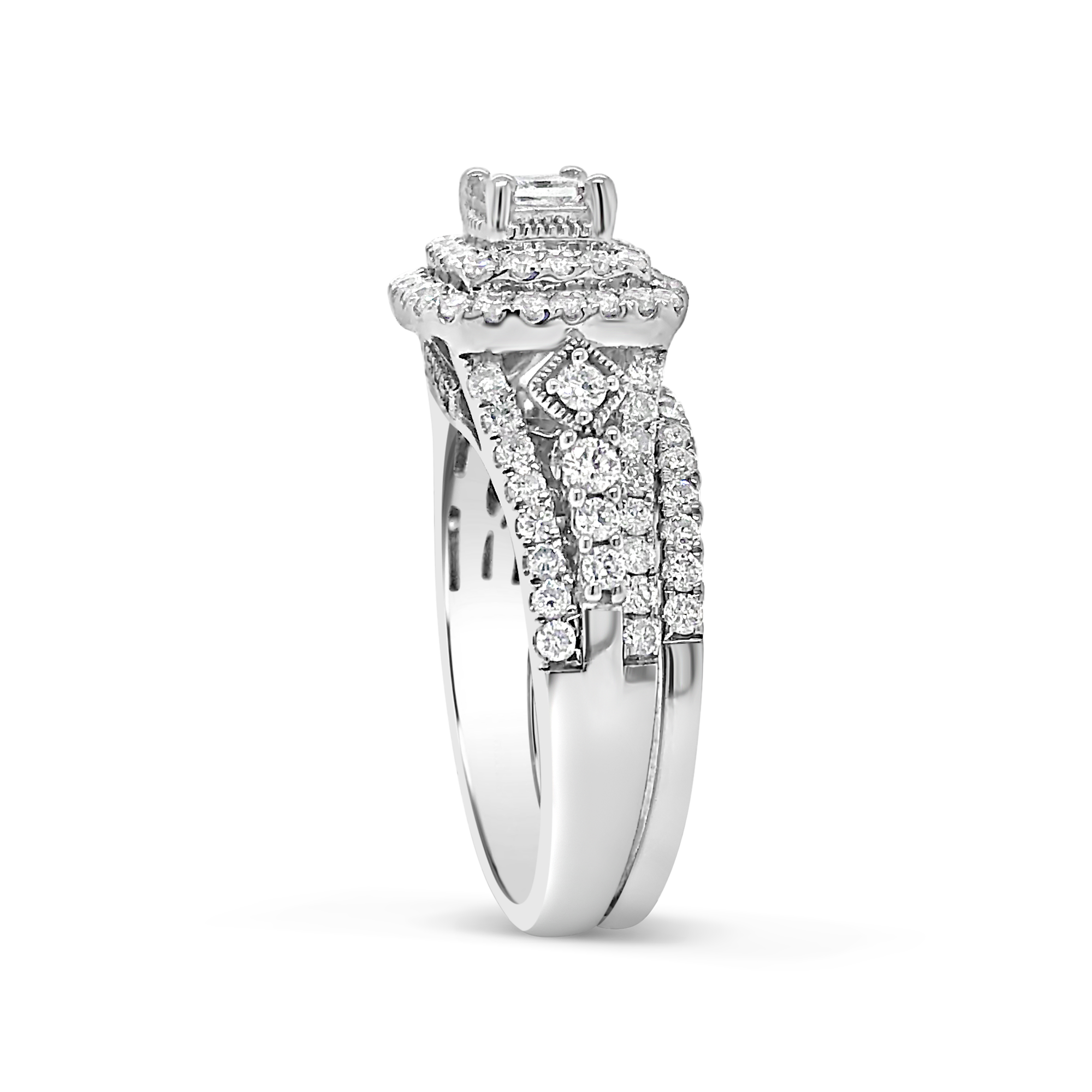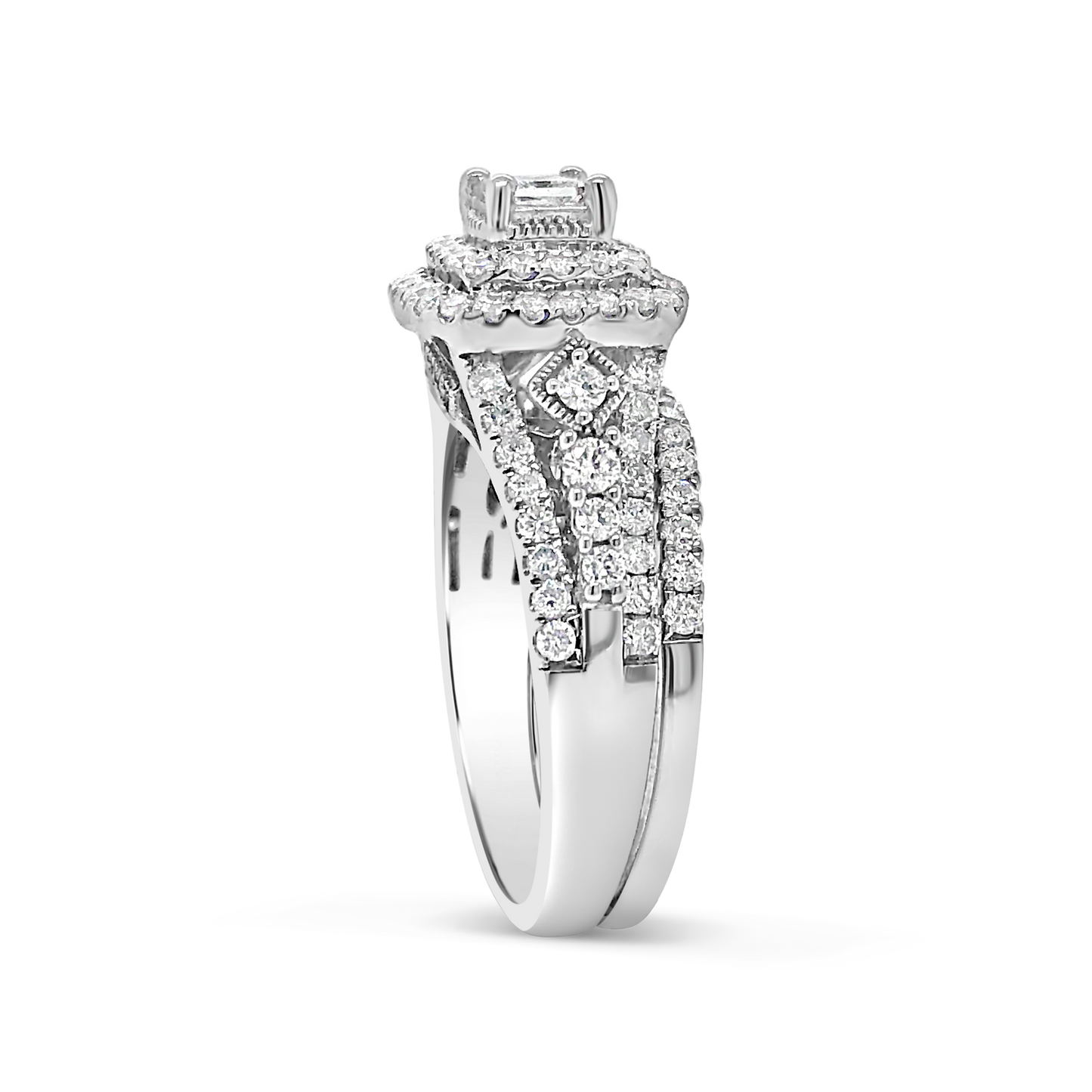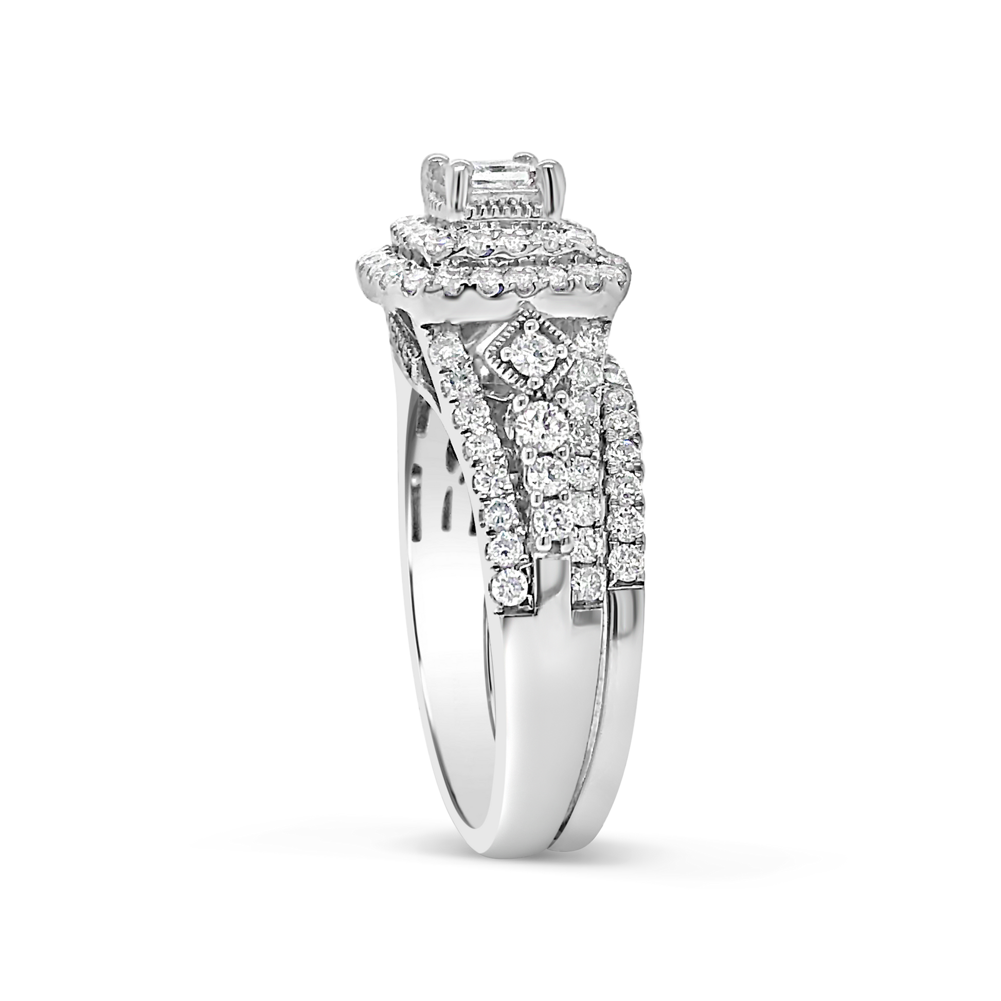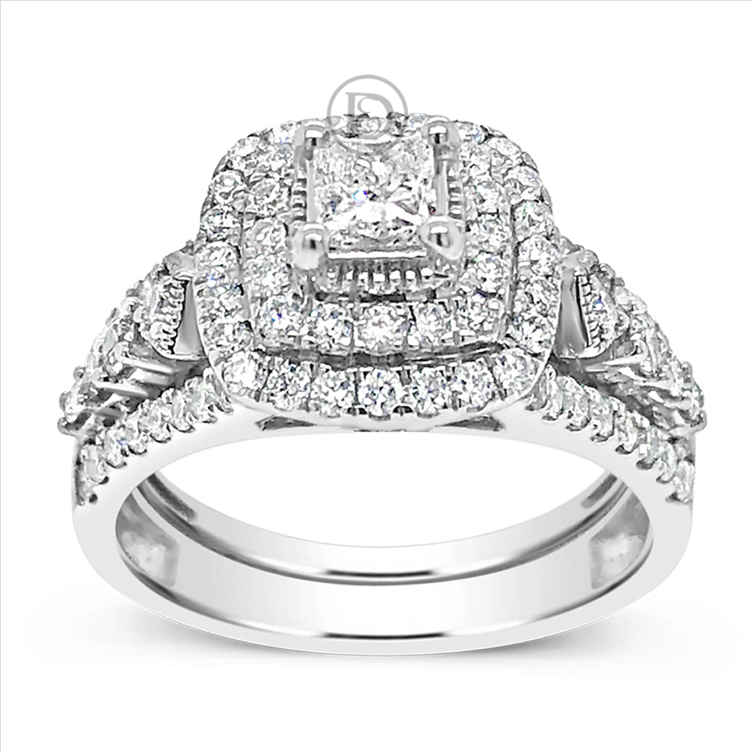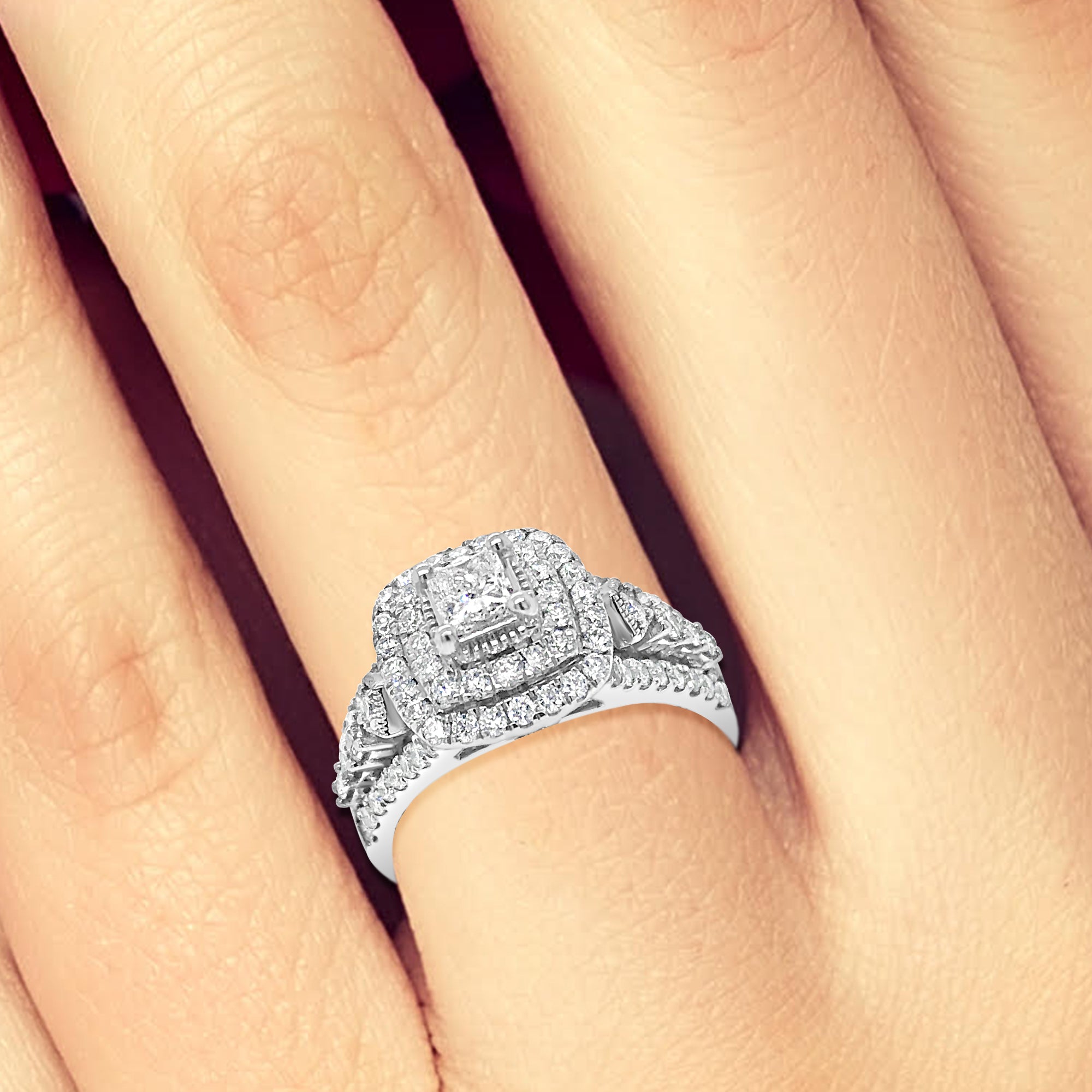 Celebrate your love in the most elegant way possible with our Diamond Halo Engagement Ring, featuring breathtaking 1.50-carat Princess Cut diamonds at its center, surrounded by a halo of enchanting Round Cut diamonds, all set in 14K White Gold. The Princess Cut diamonds are held securely in a prong setting, showcasing their impressive brilliance and fire. This Diamond Halo Engagement Ring is a true masterpiece, perfect for a woman who appreciates sophistication and glamour. The combination of Princess Cut and Round Cut diamonds creates a dazzling contrast that is sure to make a lasting impression. Order now and experience the magic of true love.
