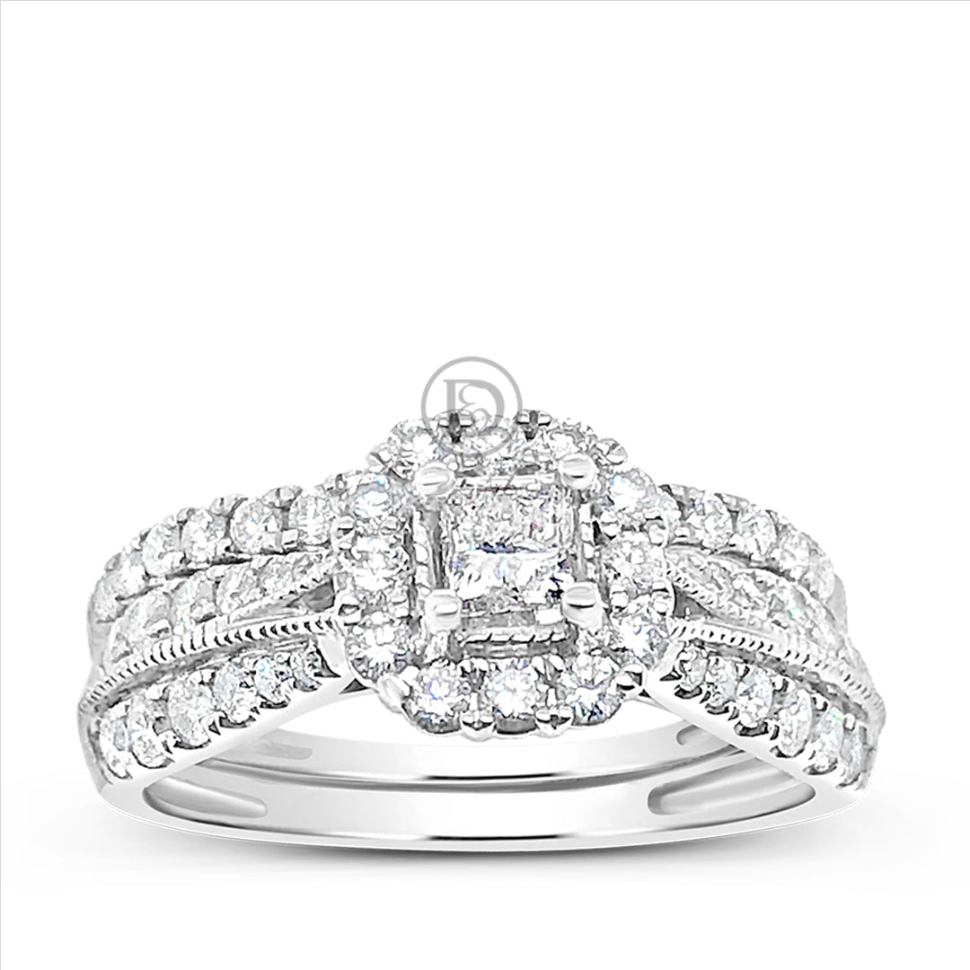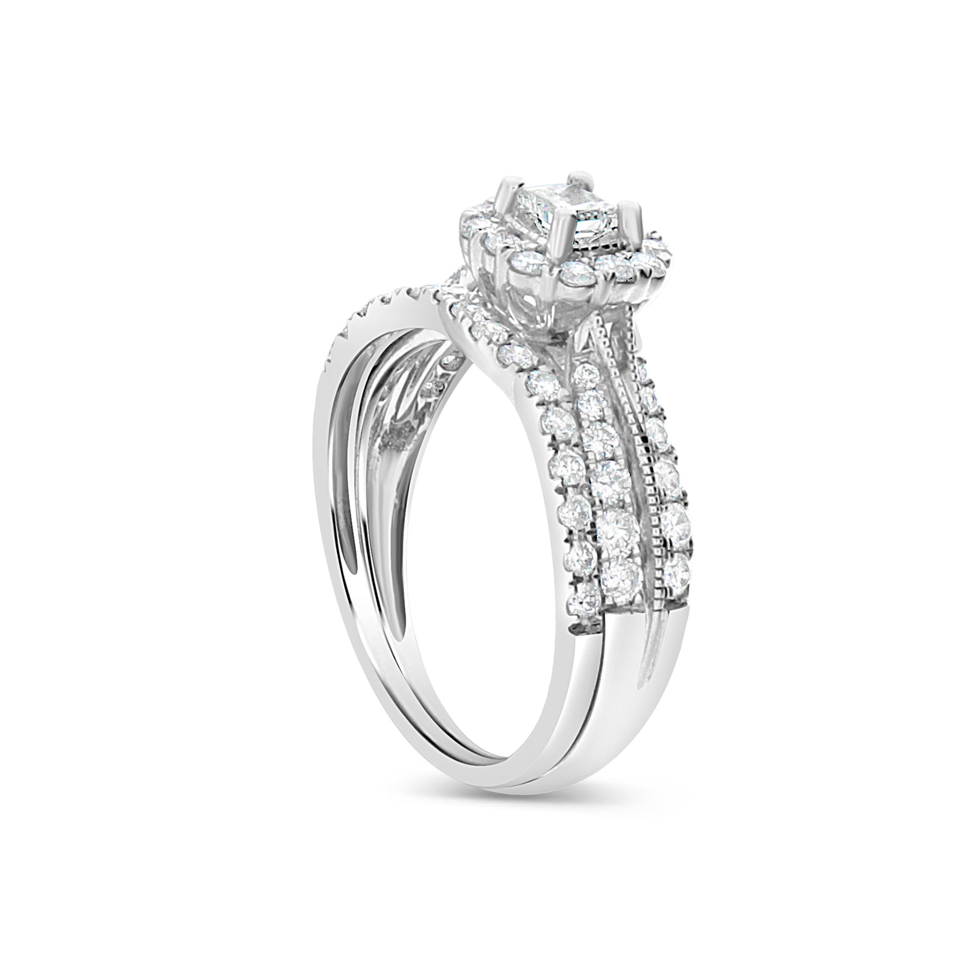 Make a grand gesture of love with this spectacular Diamond Halo Engagement Ring. Crafted with the utmost care from premium quality 14K White Gold, this ring exudes a timeless charm and elegance. The halo of dazzling Round Cut Diamonds surrounding the 1CT Princess Cut Diamonds further enhances its beauty and glamour. The smooth and polished band offers a comfortable fit and is perfect for everyday wear. This stunning ring will be a timeless and cherished reminder of the day you proposed, making it the perfect choice for the love of your life. So, take the next step in your journey together with this magnificent Diamond Halo Engagement Ring.