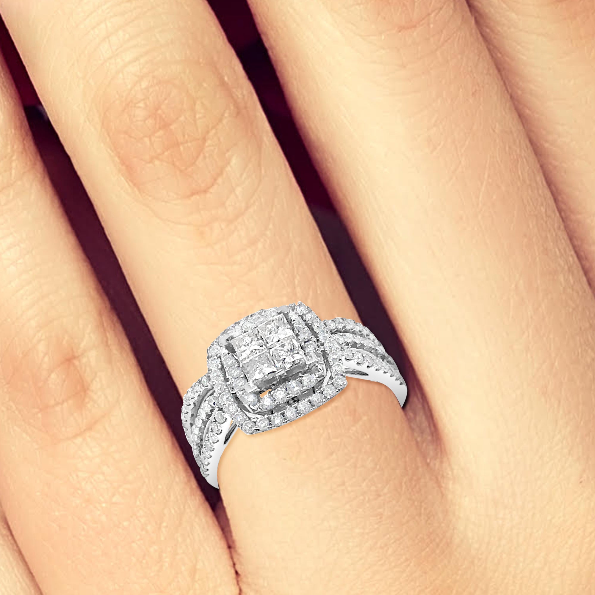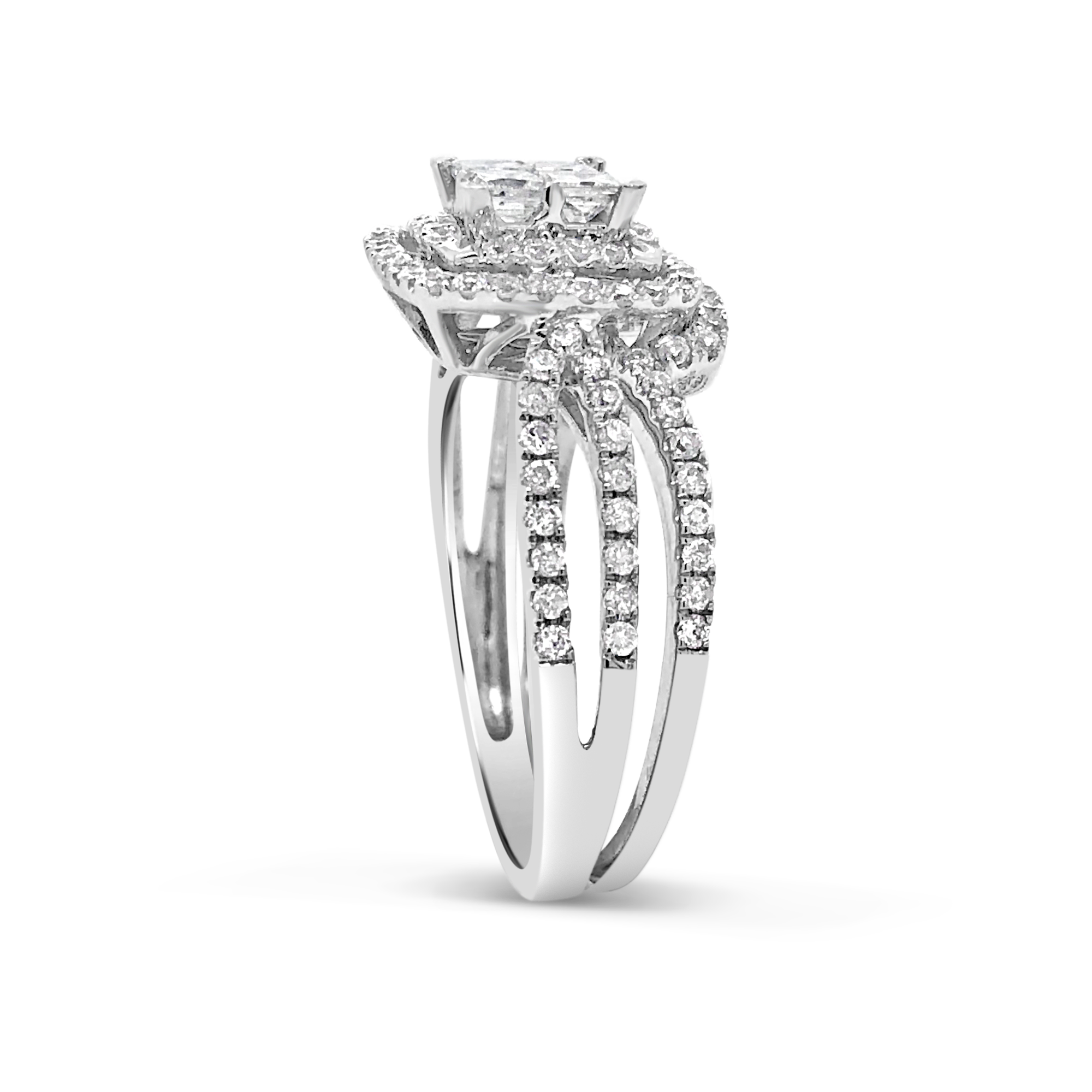 Indulge in a regal and luxurious Diamond Halo Engagement Ring, featuring majestic 1 CTW princess-cut diamonds at the center, accented with a halo of smaller round-cut diamonds. Crafted from the finest 14K white gold, this ring showcases a stunning display of beauty and sophistication. The sleek and smooth band of this Diamond Halo Engagement Ring perfectly complements the dazzling diamonds, creating a harmonious and elegant look. The 14K white gold enhances the diamonds' brilliance, creating a stunning contrast and a timeless appeal. Choose this Diamond Halo Engagement Ring and make your partner feel like royalty.