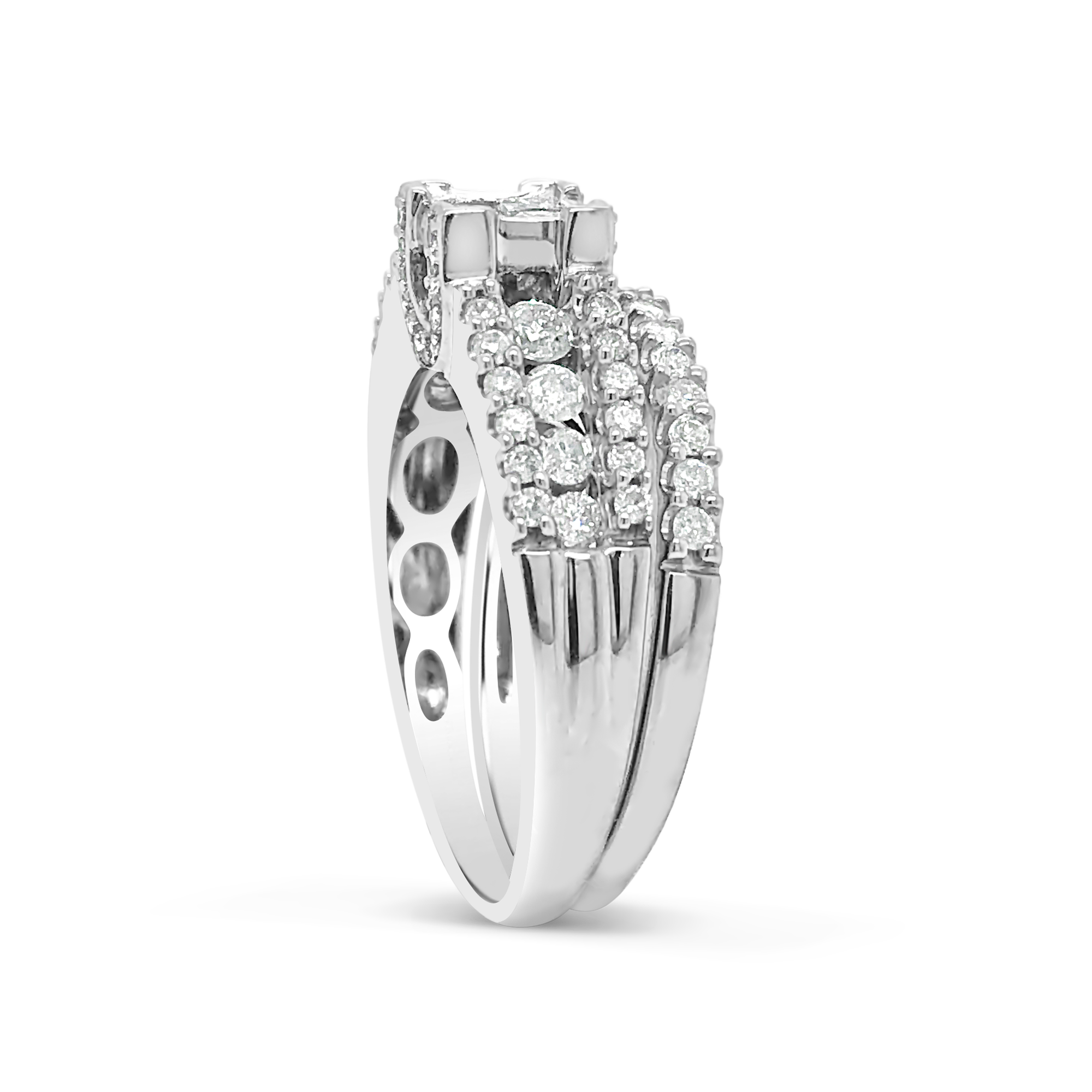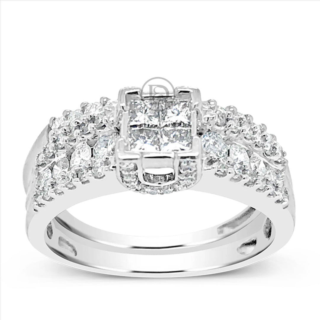 Indulge in pure elegance and sophistication with this stunning Diamond Halo Engagement Ring. Featuring magnificent 1-carat princess-cut diamonds at the center, this ring is further adorned with a breathtaking halo of shimmering round-cut diamonds, adding extra sparkle and fire to this already stunning piece. The diamonds are set in a lustrous 14K white gold band, which adds to the luxurious and timeless appeal of the ring. Perfect for a proposal, anniversary, or any special occasion, this Diamond Halo Engagement Ring is sure to take her breath away and leave a lasting impression.��