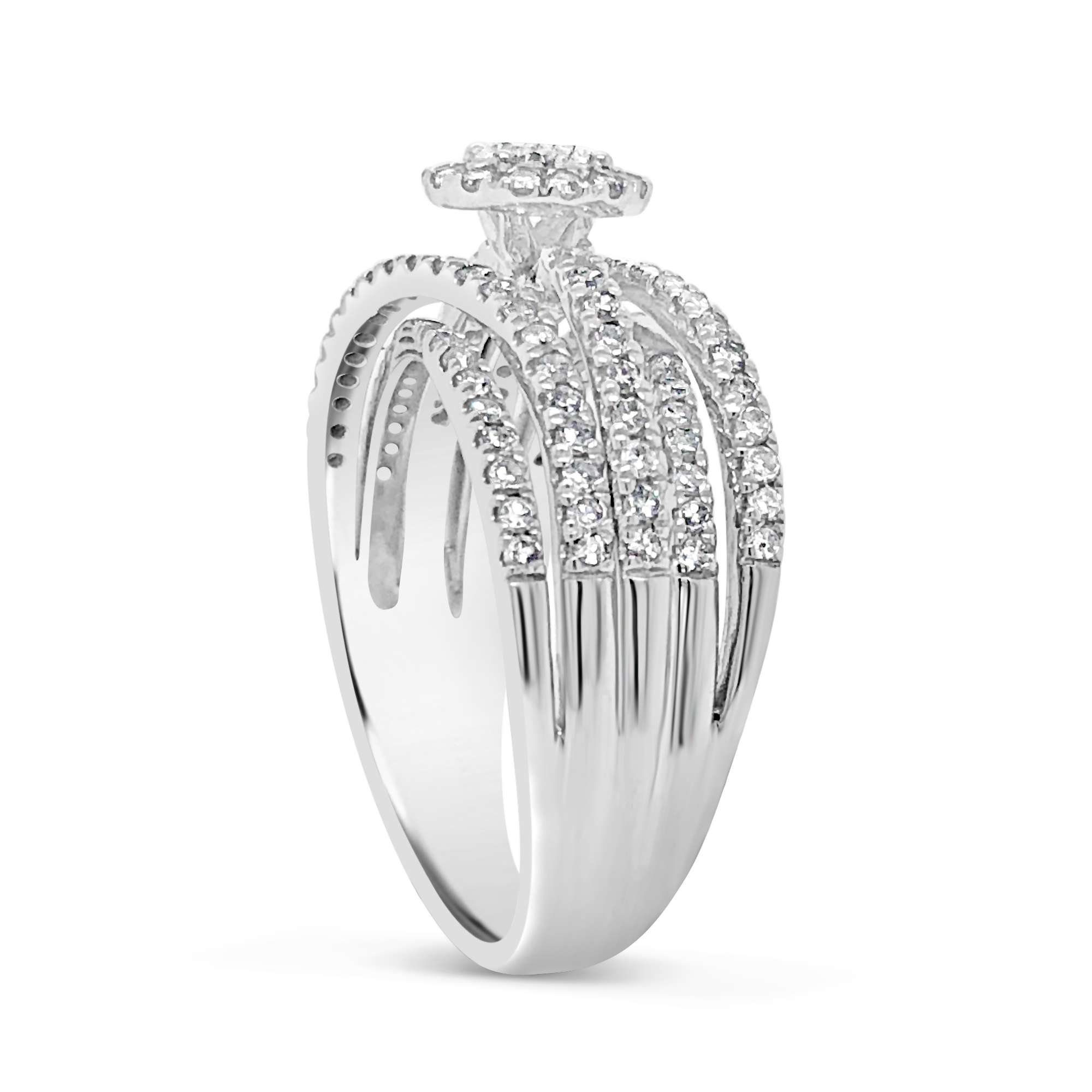 Our Diamond Halo Engagement Ring is a breathtakingly beautiful symbol of your love and commitment, featuring a stunning 1 CTW round-cut diamond at its center, surrounded by a halo of sparkling round-cut diamonds, all set in a luxurious 14K white gold band. This exquisitely detailed ring was made to highlight the diamonds' fire and brightness, capturing the beauty of your love in every facet. The halo of diamonds around the center diamond gives the piece an additional dimension of brilliance and elegance. The central diamond is expertly cut to highlight its excellent clarity and shine. The 14K white gold band creates a contemporary setting that accentuates the brilliance of the diamonds as the ideal partner for them.
