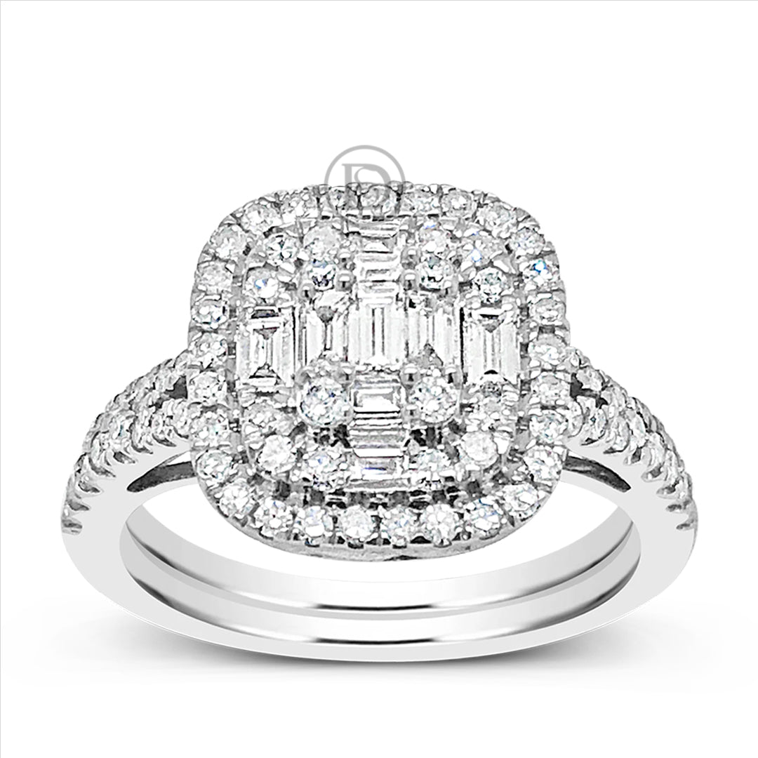 - Diamond halo engagement ring 1 ctw round cut w/ bagguetts 14k white gold