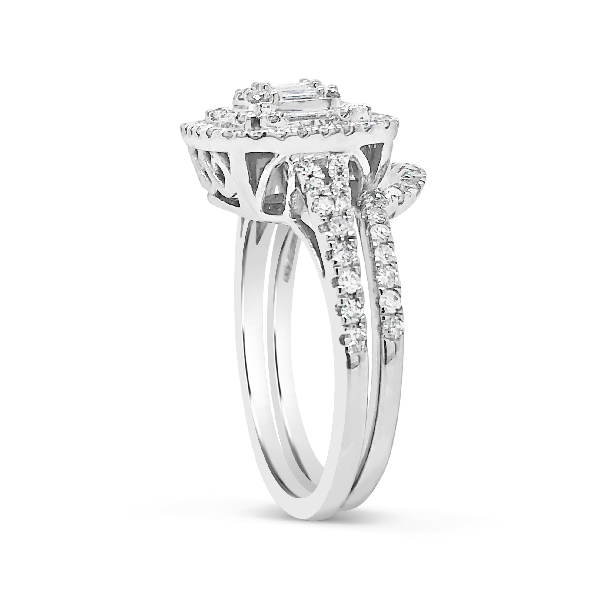 - Diamond halo engagement ring .95 ctw princess w/ round cut & baguettes 14k white gold