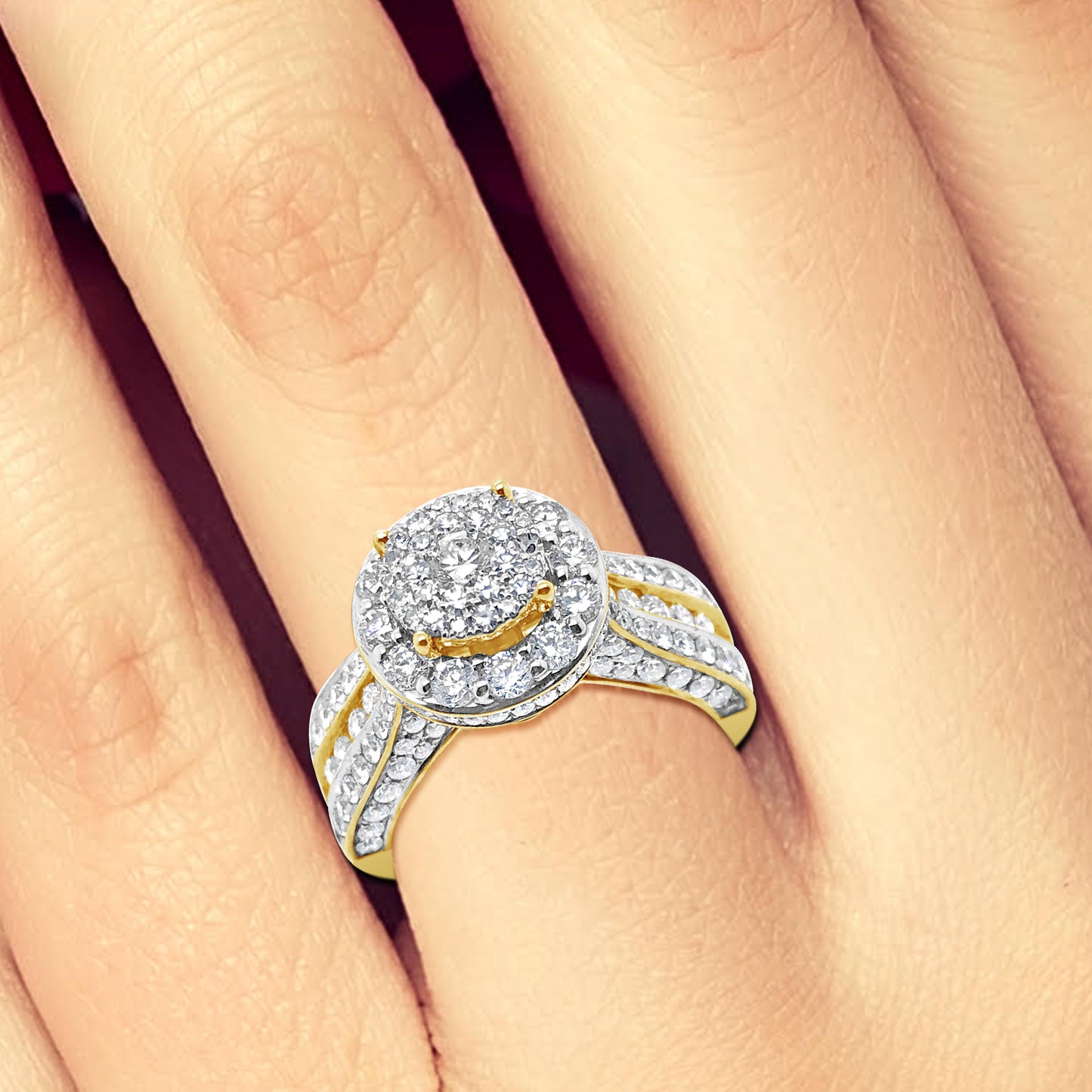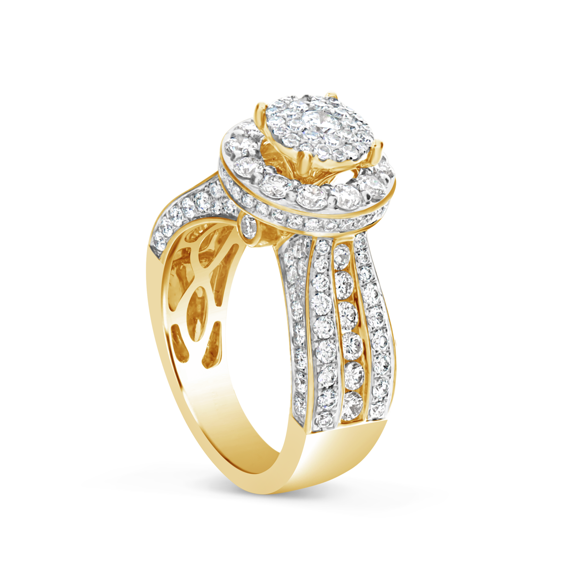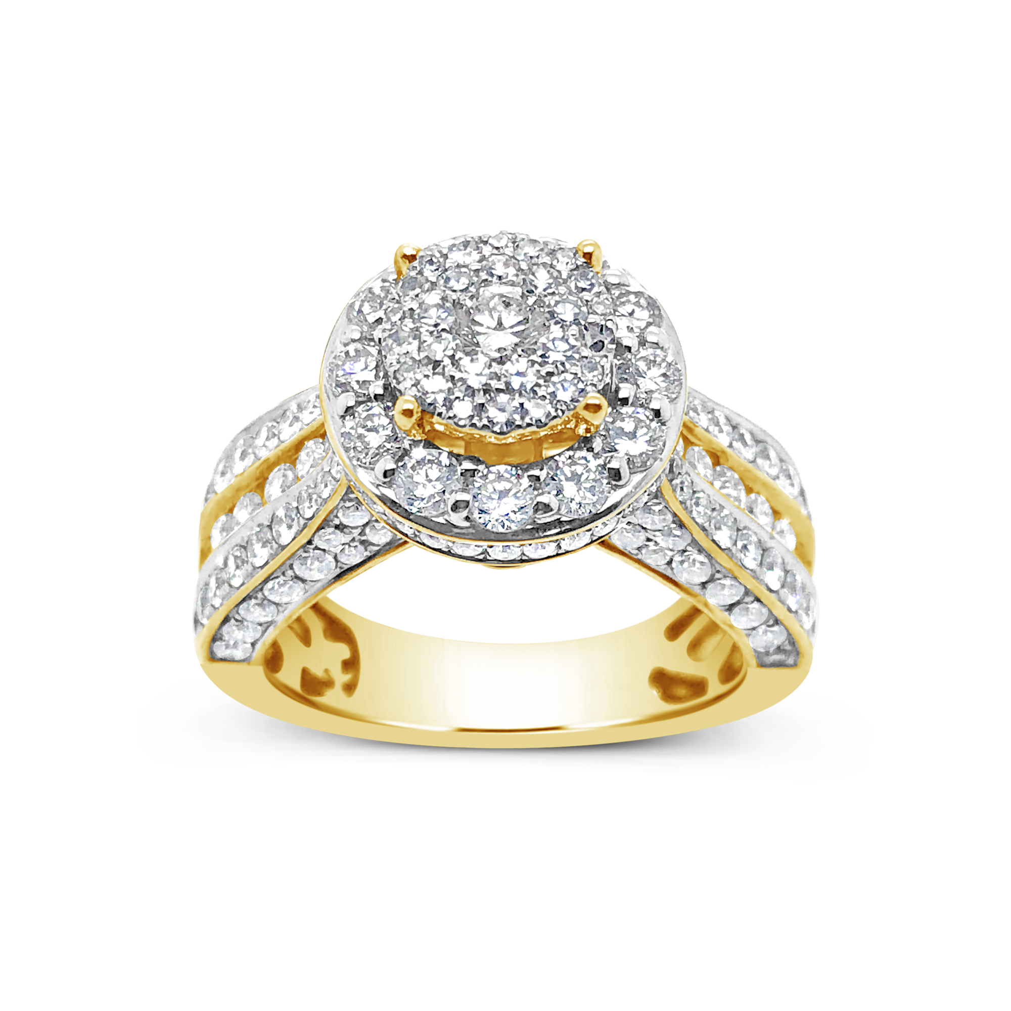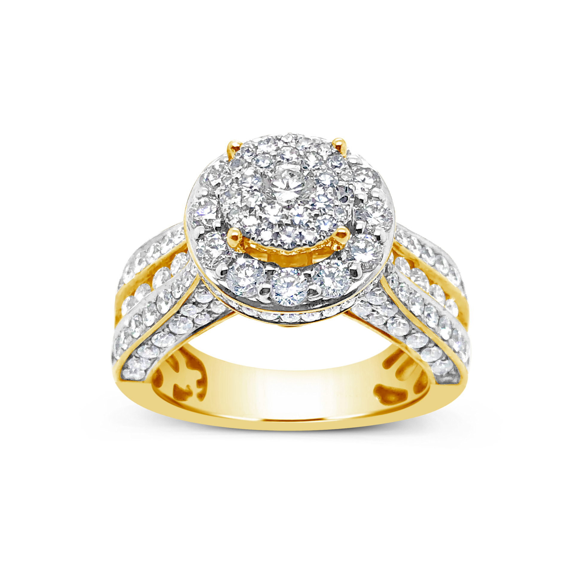 Make a statement of timeless elegance with this stunning Diamond Halo Engagement Ring. Crafted from 14K yellow gold, this ring features a breathtaking 2.30-carat total weight of round cut diamonds, artfully set in a halo design to maximize their brilliance and sparkle. The centerpiece of this ring is the 2.30-carat total weight of round cut diamonds, chosen for their exceptional quality and beauty. The diamonds are carefully arranged in a halo design, which enhances their natural radiance and adds a touch of sophistication and glamour to the ring. Give her a ring that will take her breath away and let her know that your love for her is everlasting.