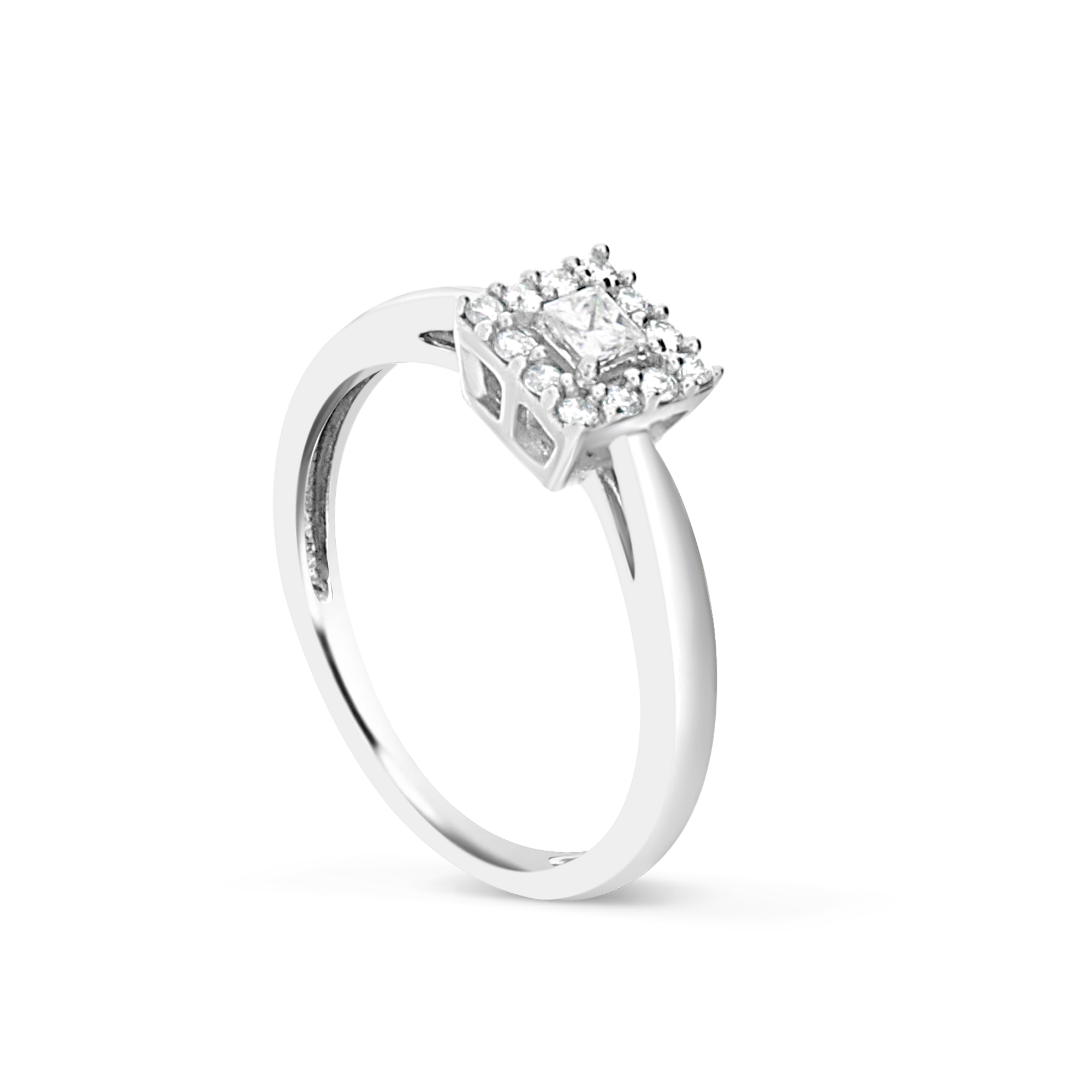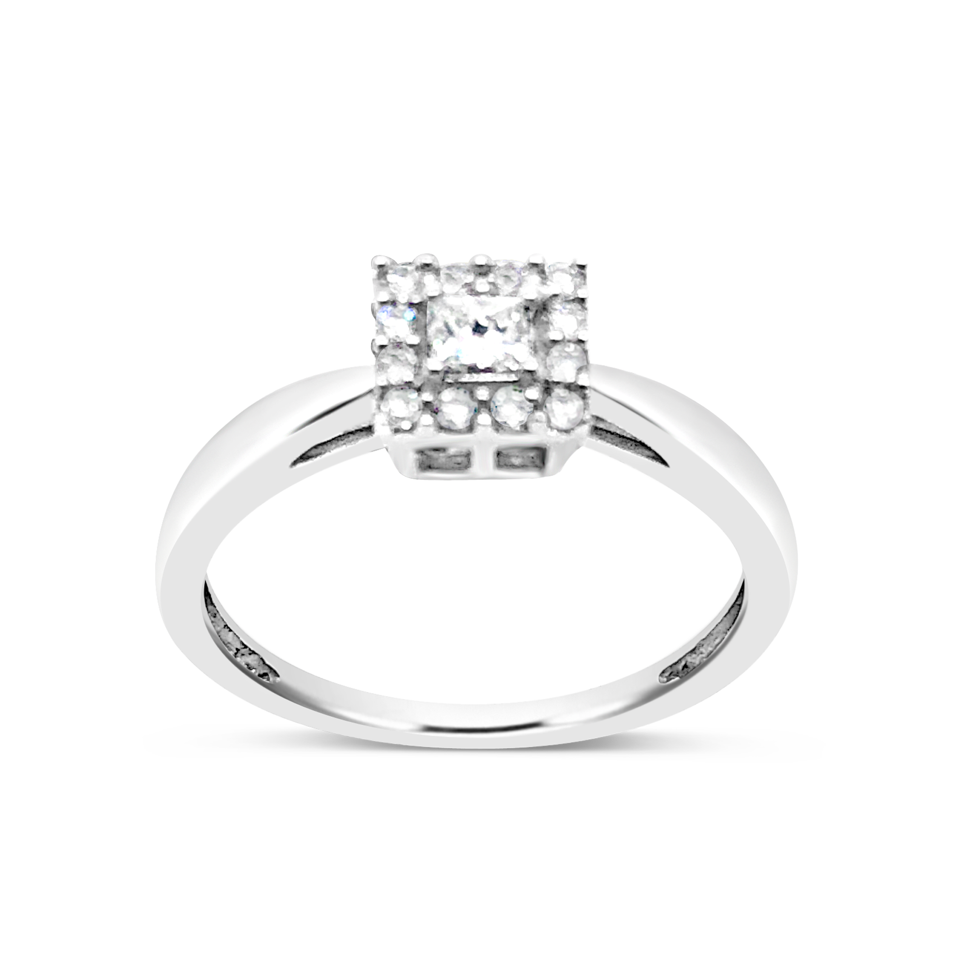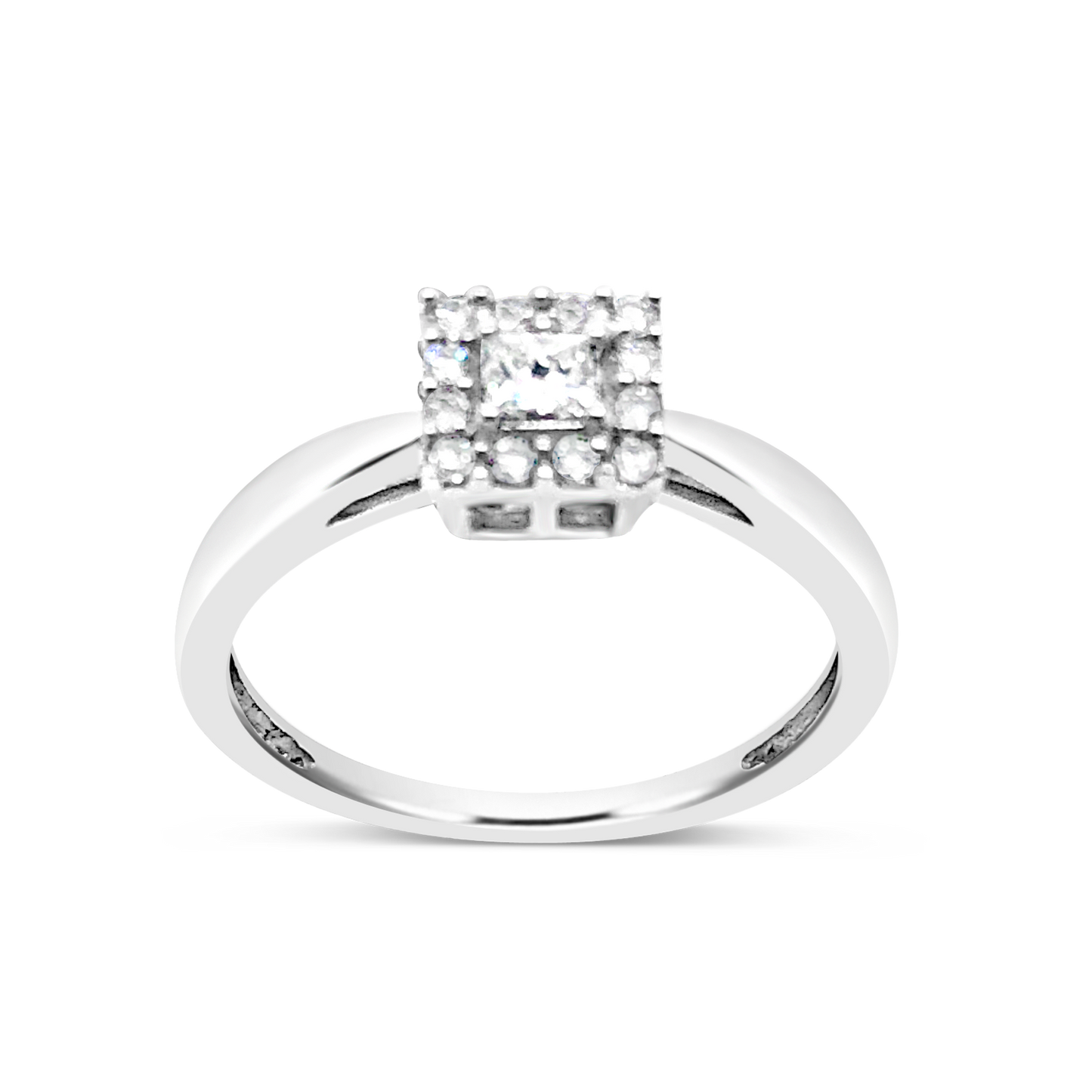 Declare your love with this gorgeous Diamond Halo Engagement Ring, a dazzling piece that will take her breath away. The ring features a brilliant .25-carat princess cut diamond, surrounded by a halo of sparkling round cut diamonds, all set in a lustrous 10K white gold band. Crafted from high-quality 10K white gold, this engagement ring is not only beautiful but also durable and long-lasting.