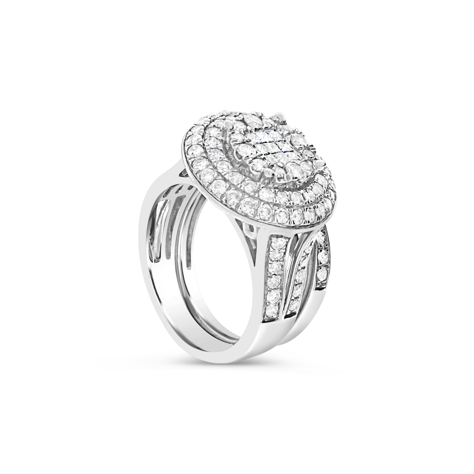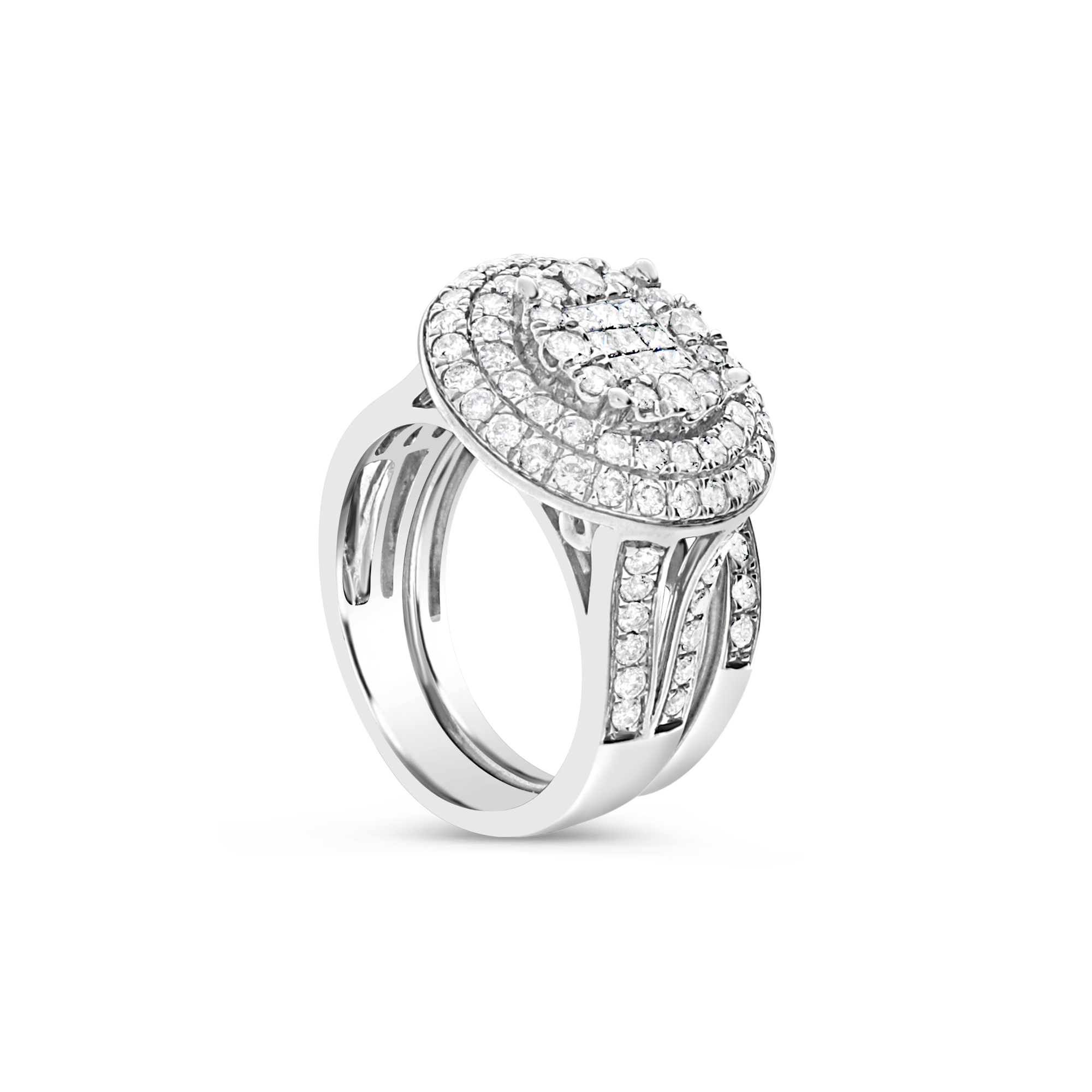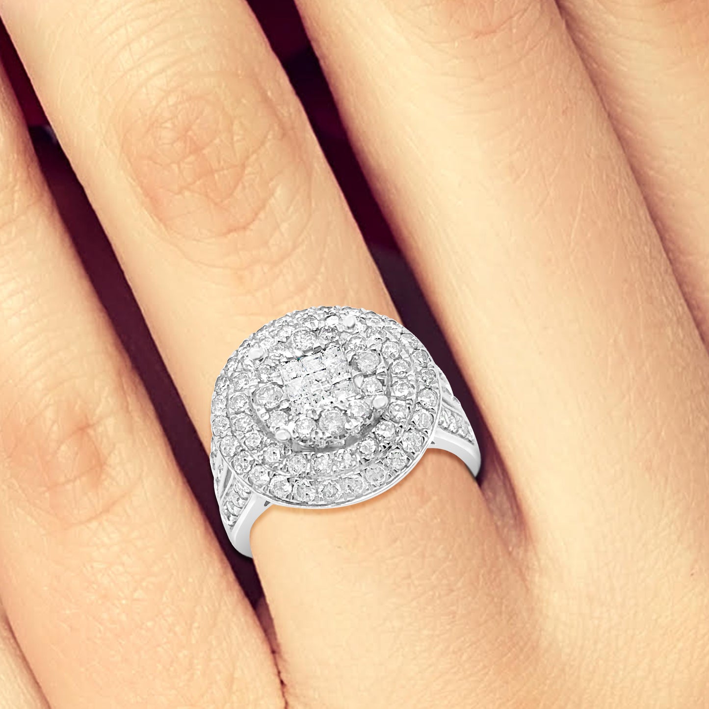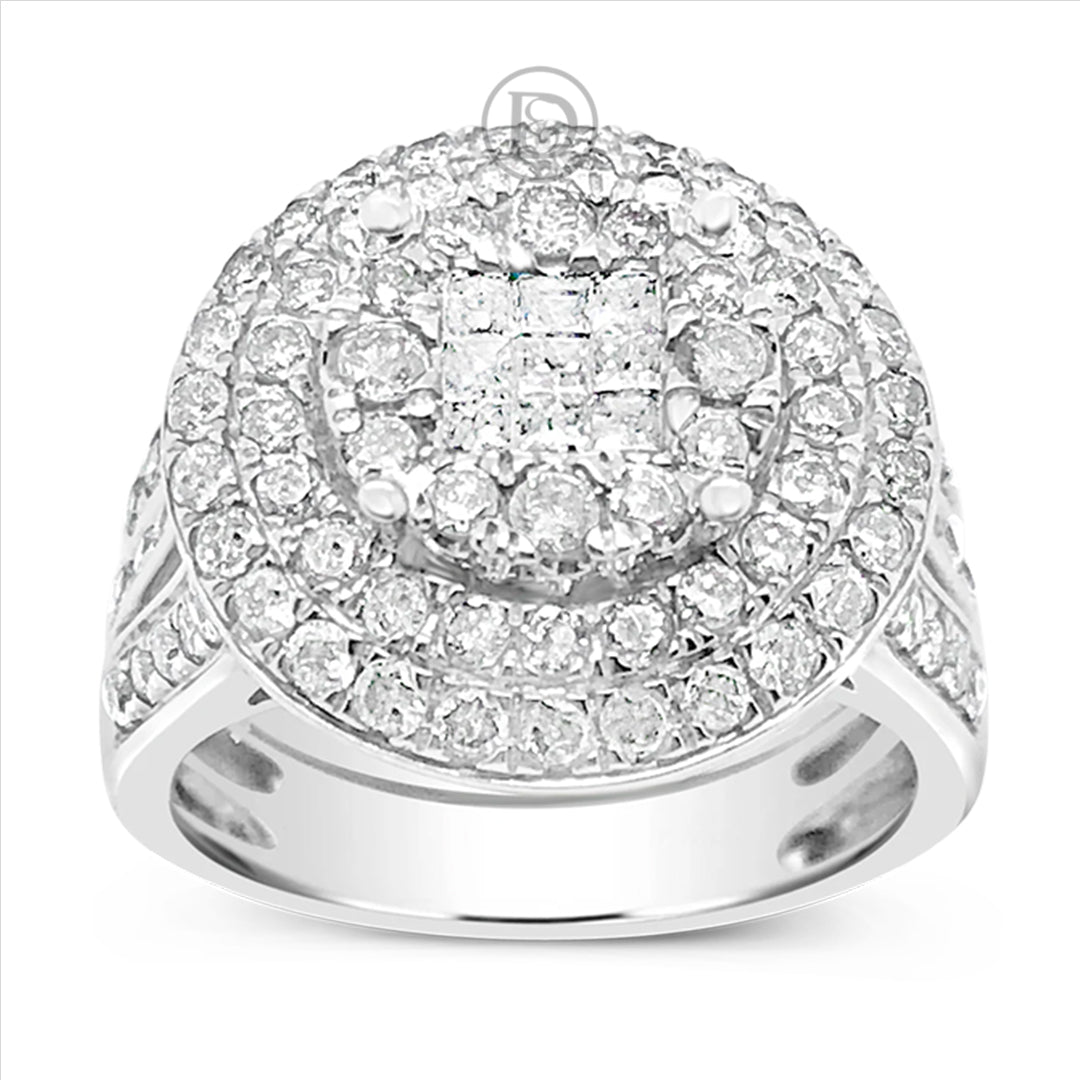 This beautiful Diamond Halo Engagement Ring boasts an impressive 2 carats of brilliant sparkle. The center stone is majestic princess-cut diamonds, expertly crafted to reflect light from every angle. Surrounding the centerpiece are dazzling round-cut diamonds, which amplify the ring's glamour and radiance. The band is also set with Round Cut diamonds, and the shank is crafted from high-quality 10K White Gold, which gives the ring a classic, sophisticated look. Whether you're looking for an engagement ring that will stand the test of time or a beautiful anniversary gift, this 2 CTW Princess w/ Round Cut Halo Engagement Ring is sure to make a lasting impression.