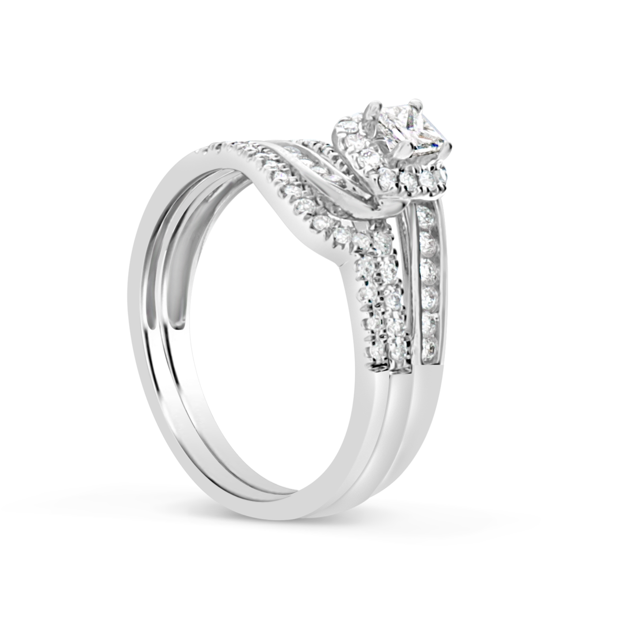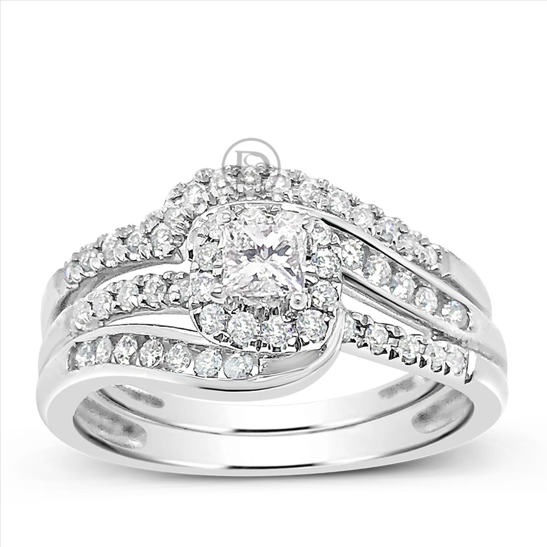 Declare your love with this stunning Diamond Halo Engagement Ring. Crafted from premium 10K white gold, this ring features a captivating .67 carat total weight of princess and round cut diamonds that will take your partner's breath away. The centerpiece of this ring is dazzling princess-cut diamonds, complemented by smaller round diamonds that are expertly set in a halo design. Surprise your partner with this beautiful Diamond Halo Engagement Ring, a symbol of your love and commitment that will shine bright for a lifetime.