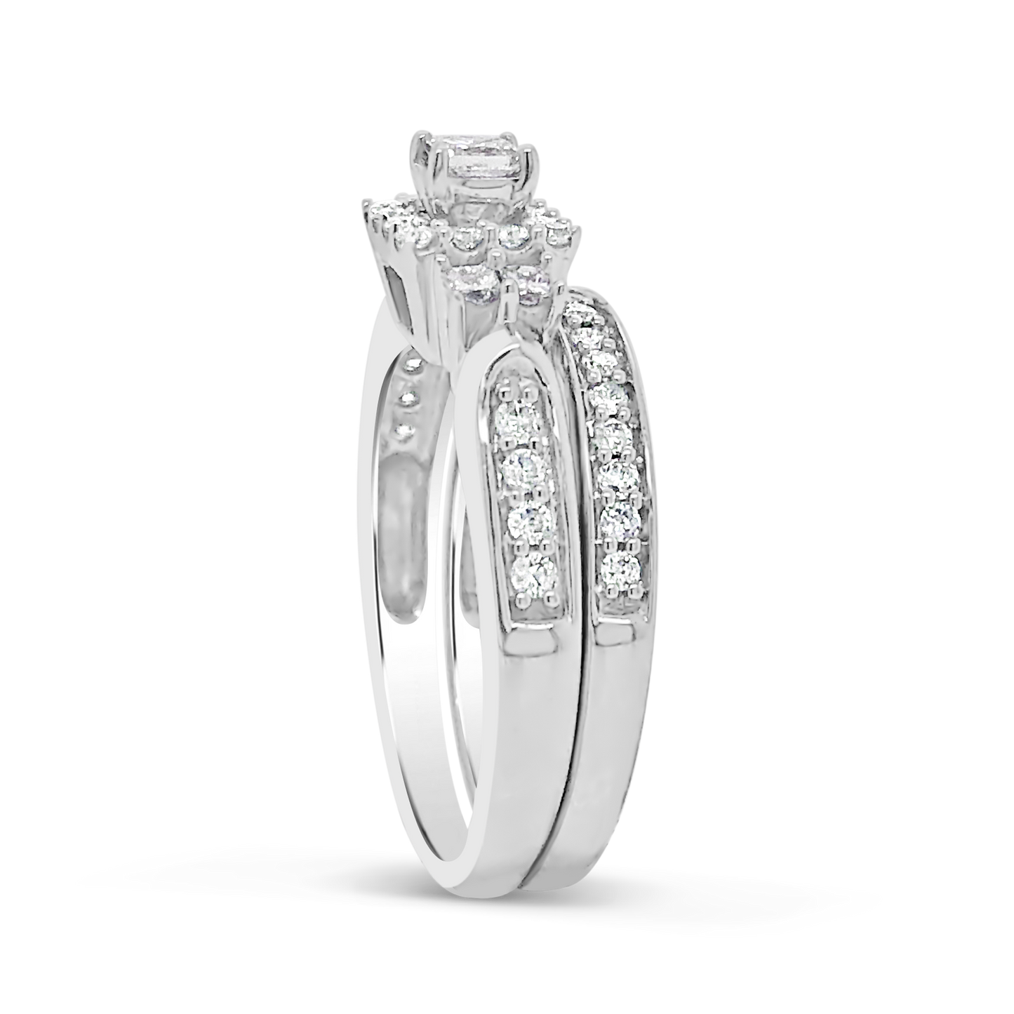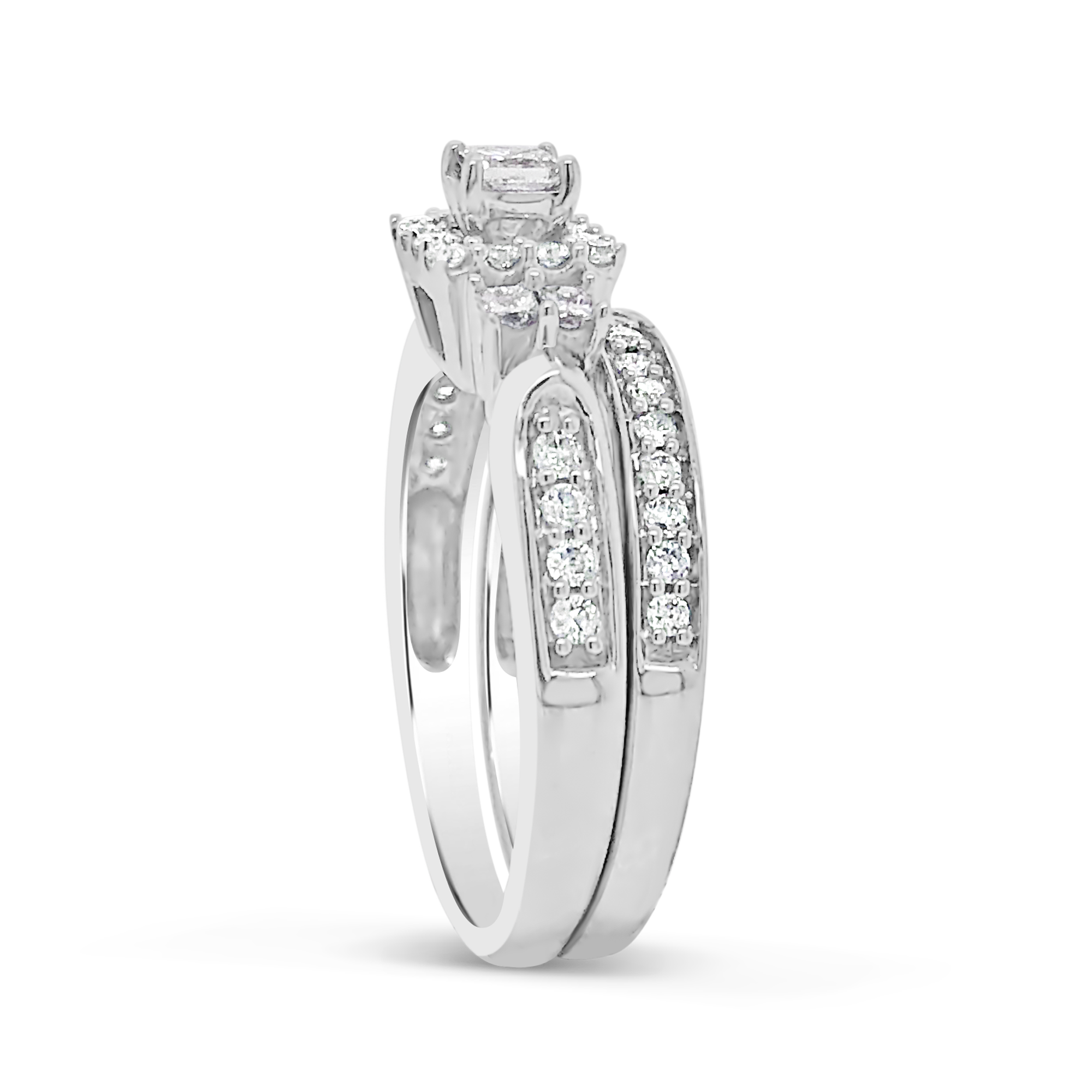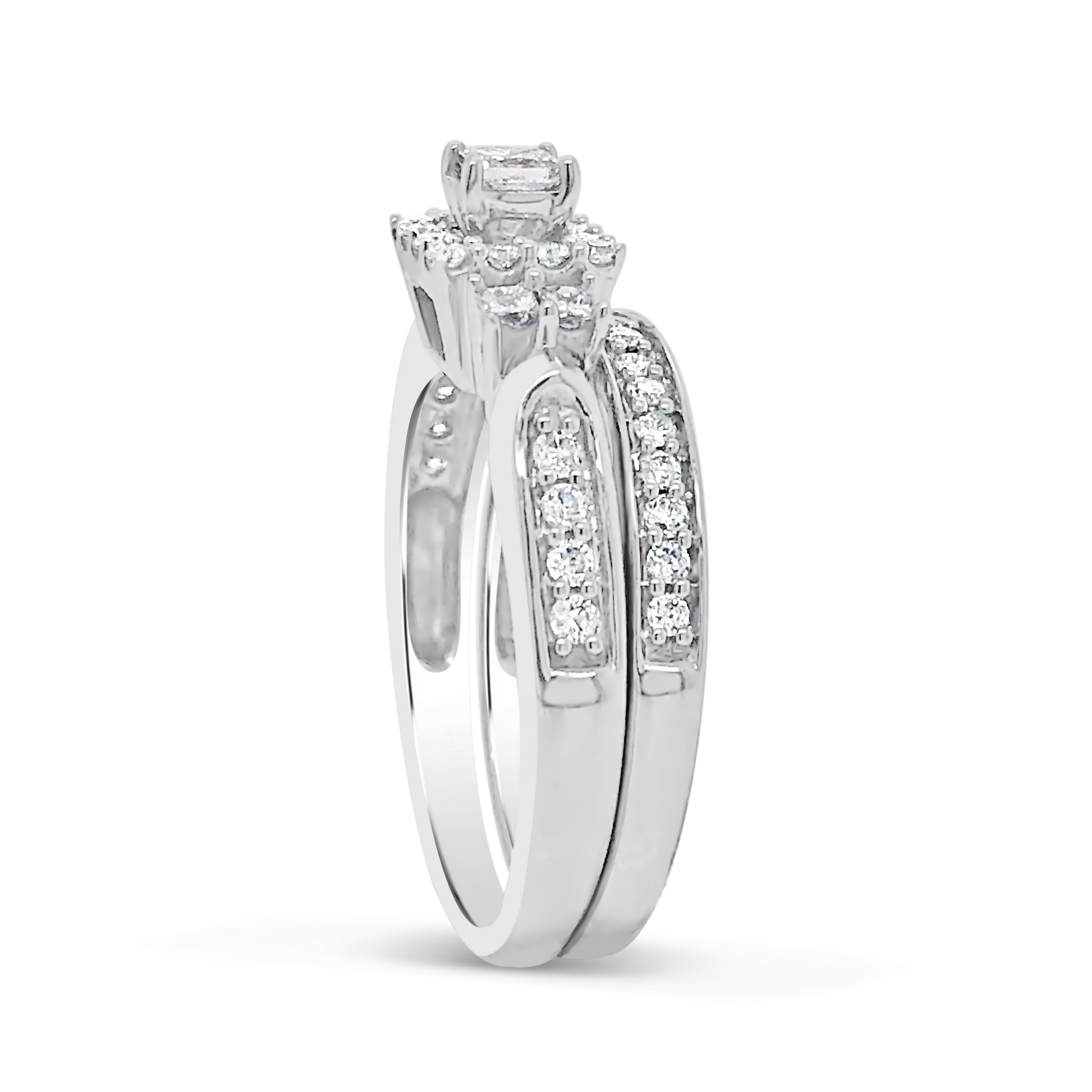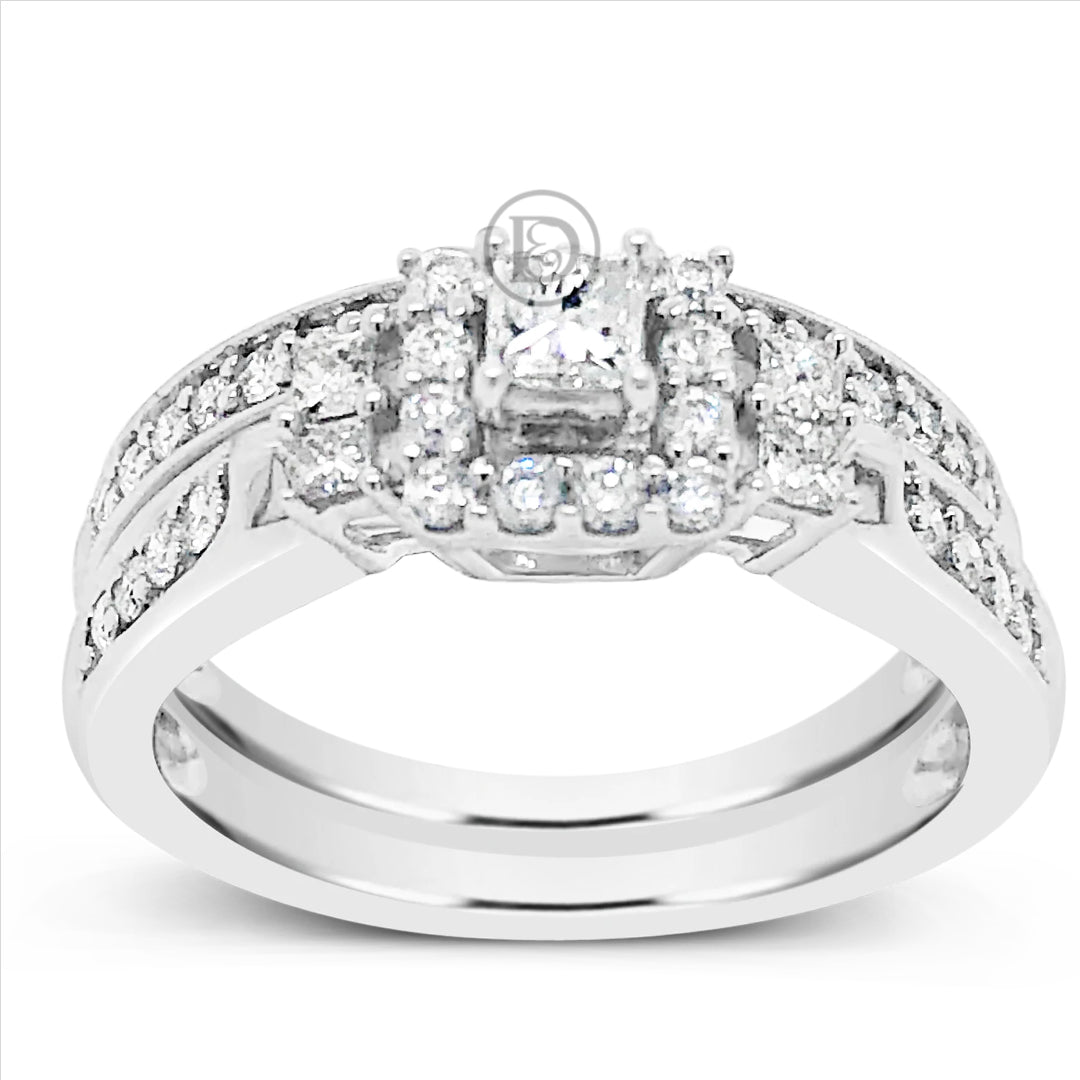 Mark your love with this stunning Diamond Halo Engagement Ring that exudes an aura of elegance and sophistication. The ring boasts a mesmerizing .70-carat total weight of diamonds that are set in a graceful 14K white gold band. The centerpiece of the ring is captivating princess-cut diamonds that are held securely by four prongs and encircled by a halo of smaller round diamonds. The band is meticulously crafted to provide a perfect fit and an exceptional comfort level. This Diamond Halo Engagement Ring is the perfect expression of your love and commitment to your partner.