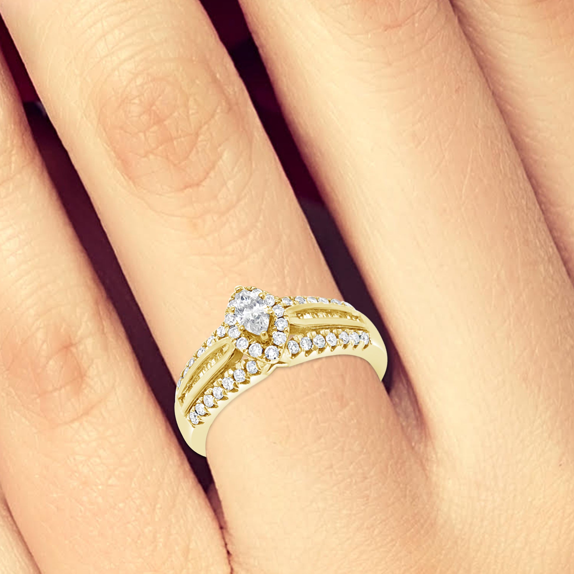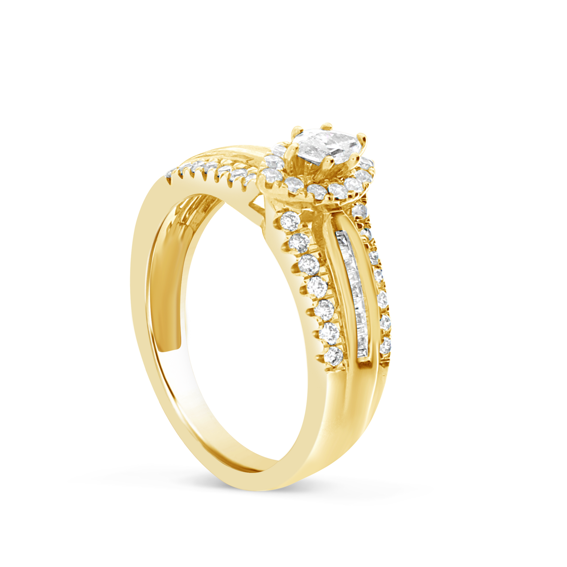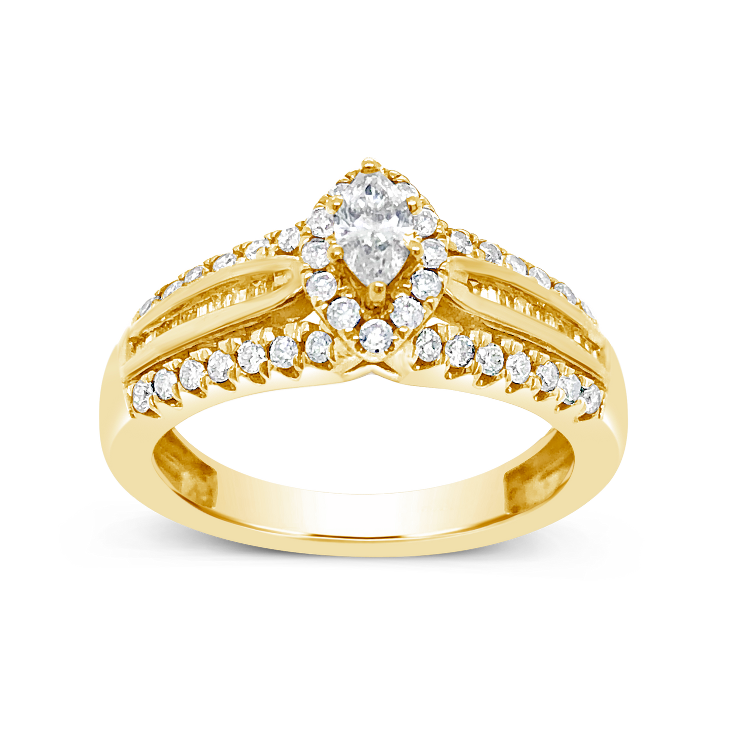 Make your proposal truly unforgettable with this breathtaking Diamond Halo Engagement Ring. It features a stunning .75-carat total weight of marquise, round, and baguette-cut diamonds. The ring is crafted in 14K yellow gold, adding a warm and luxurious touch to the overall design. Crafted with precision and care, this engagement ring is designed to last a lifetime. The 14K yellow gold band is sturdy and refined, with a timeless design that will never go out of style.