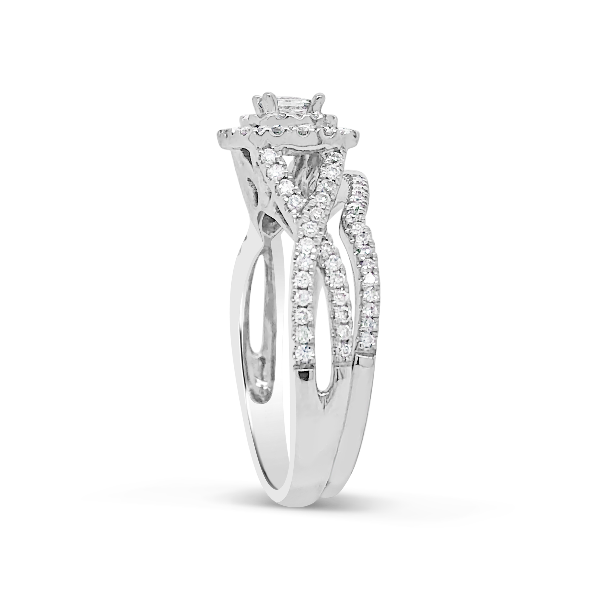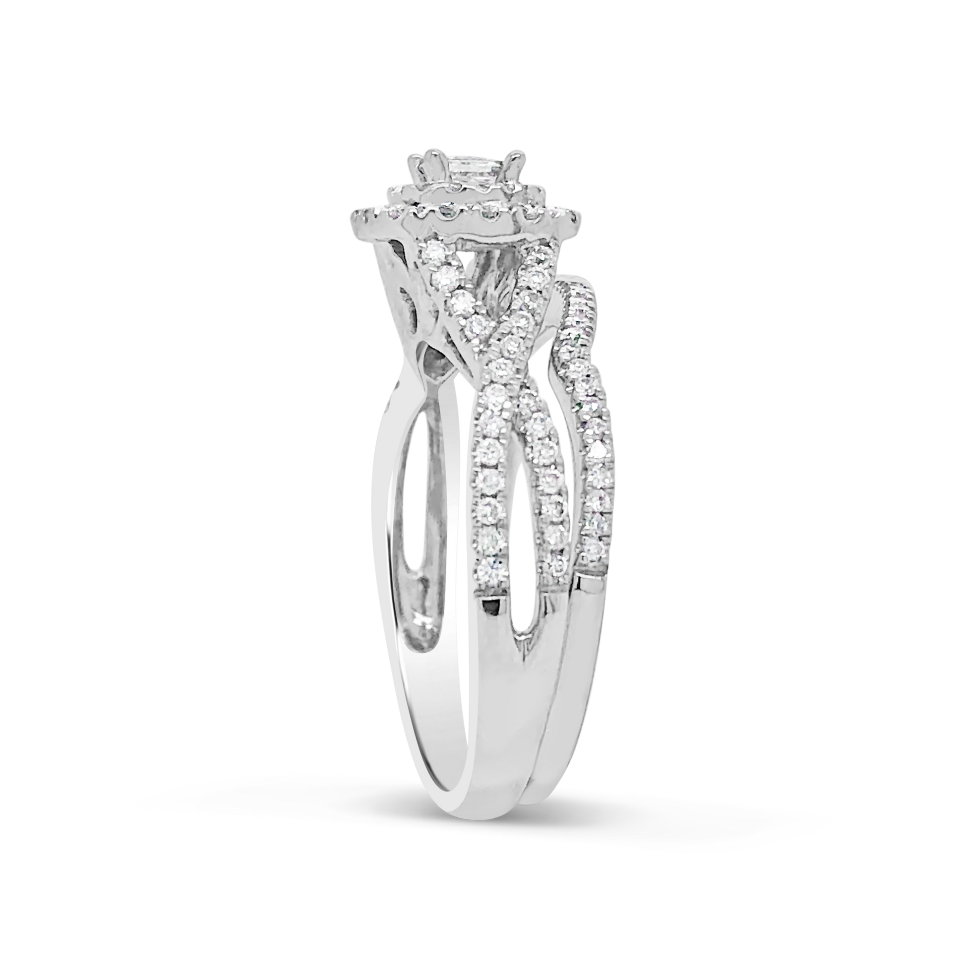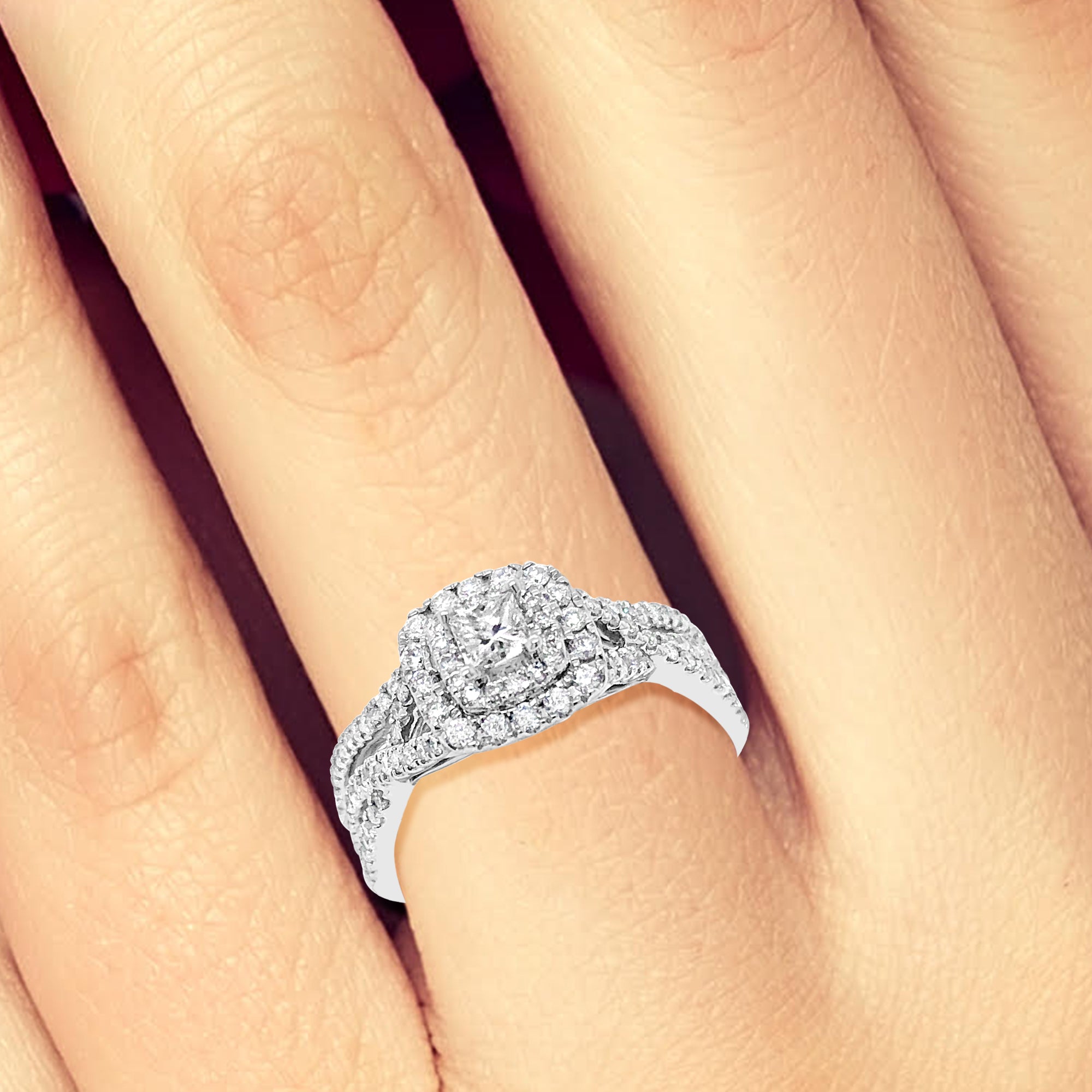 Elevate your proposal to new heights with this stunning Diamond Halo Engagement Ring. The ring features magnificent princess-cut diamonds at the center, weighing 0.50 CTW, and is accented with a halo of smaller round-cut diamonds. Crafted from the finest 14K white gold, this ring exudes elegance and sophistication.