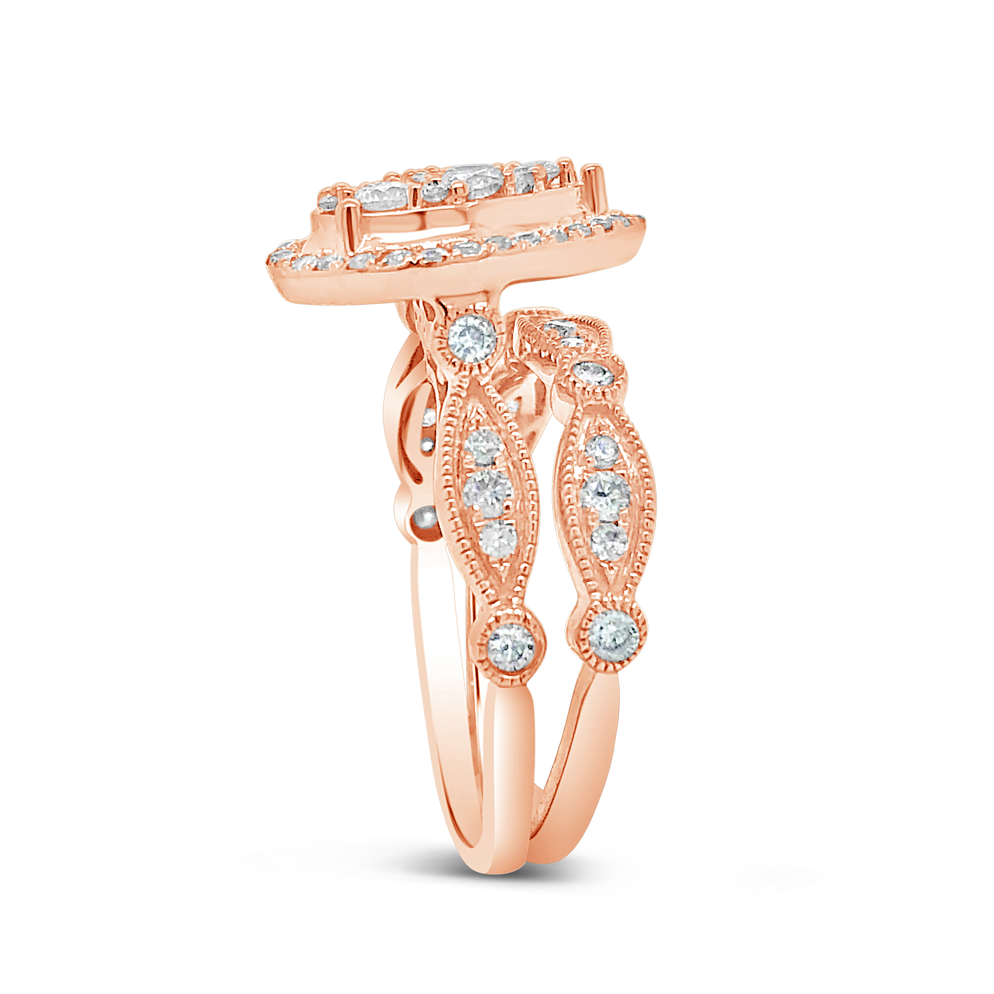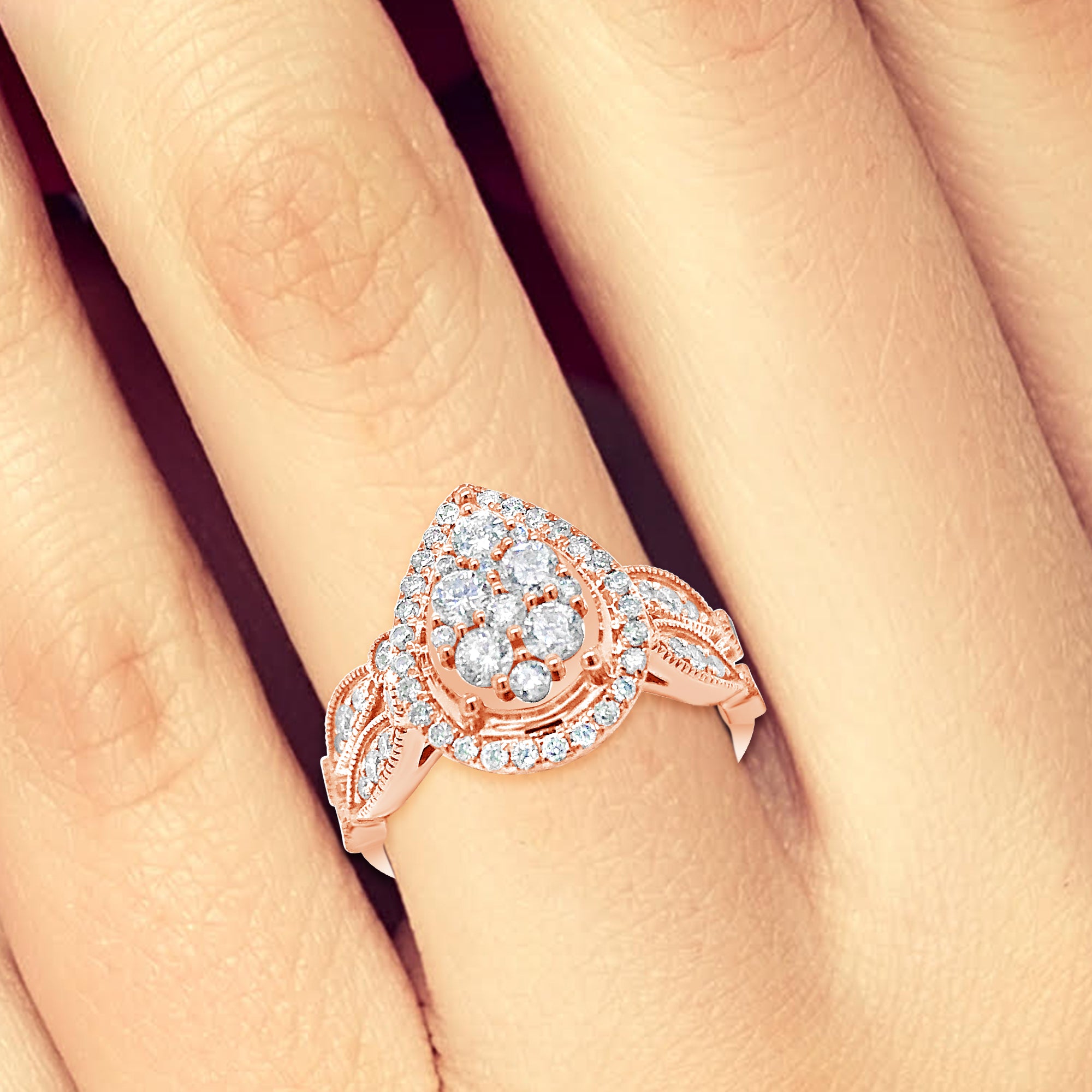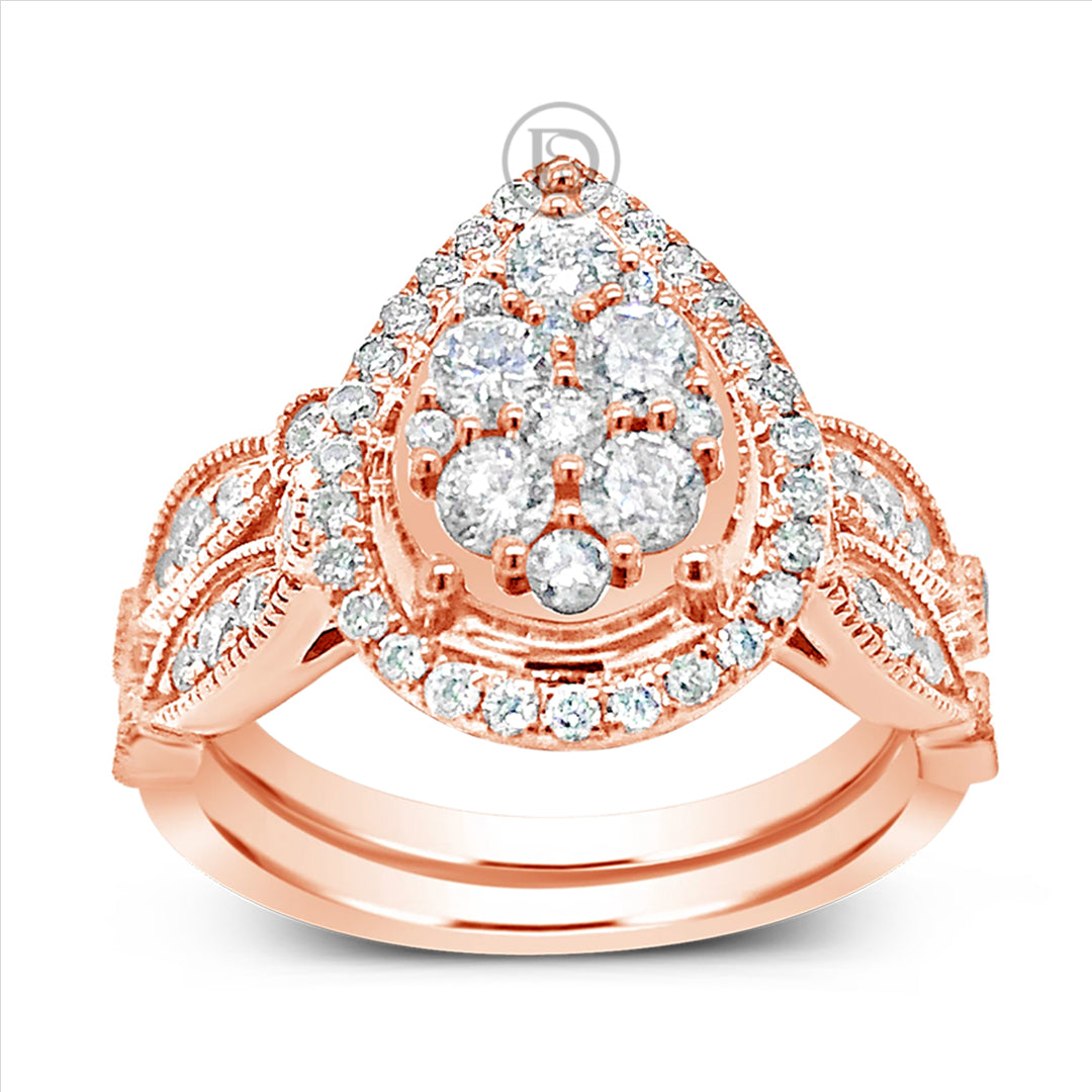 Make a lasting impression with this Diamond Halo Pear Shaped Engagement Ring. Crafted in luxurious 14K Rose Gold, the center stone is a pear-shaped diamond surrounded by a halo of round cut diamonds. With its 1 CTW of total diamond weight, this ring will add sparkle and brilliance to any special occasion. The pear-shaped setting reveals the diamond from every angle, creating a dazzling and elegant look that will surely make heads turn. Show your love with this exquisite piece and make it an unforgettable moment.