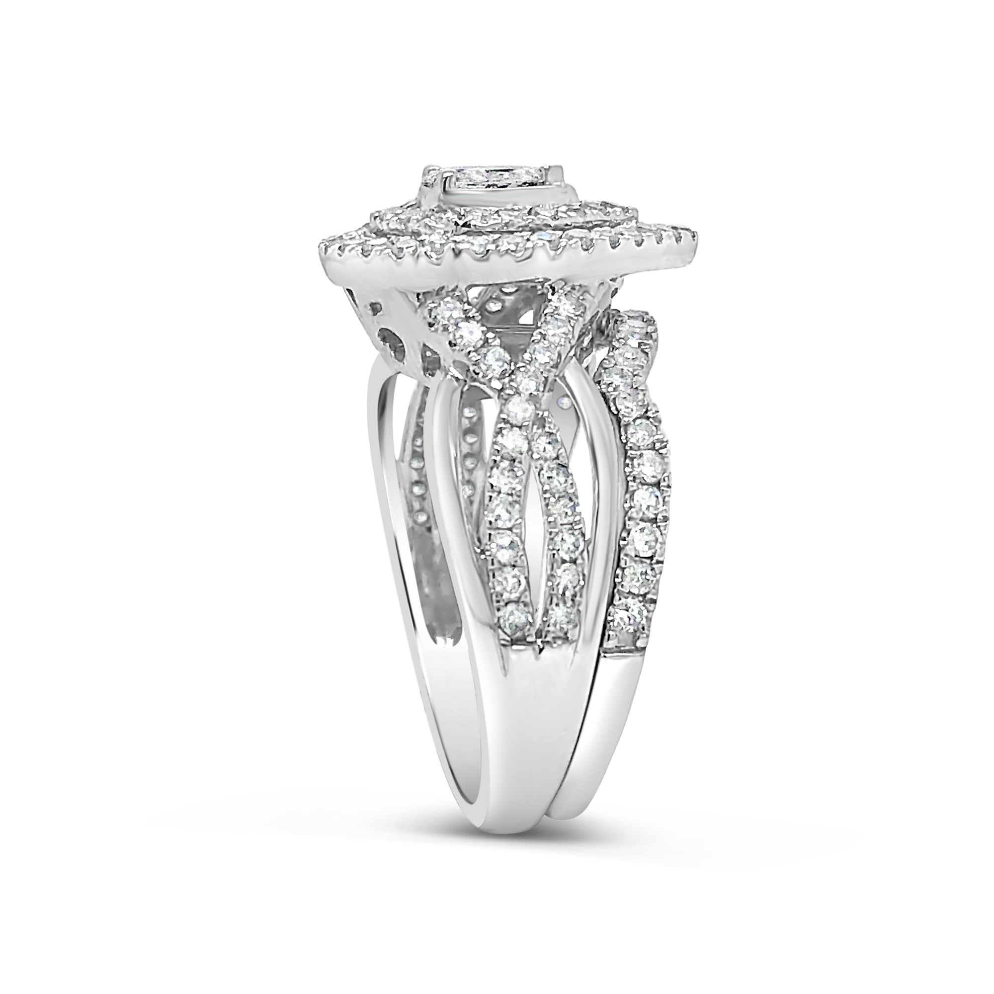The diamonds contrast sharply with the band's fine 14K white gold construction, giving the piece a classic and refined appearance. The round-cut diamonds set along the band add even more brilliance, making this ring a true showstopper.