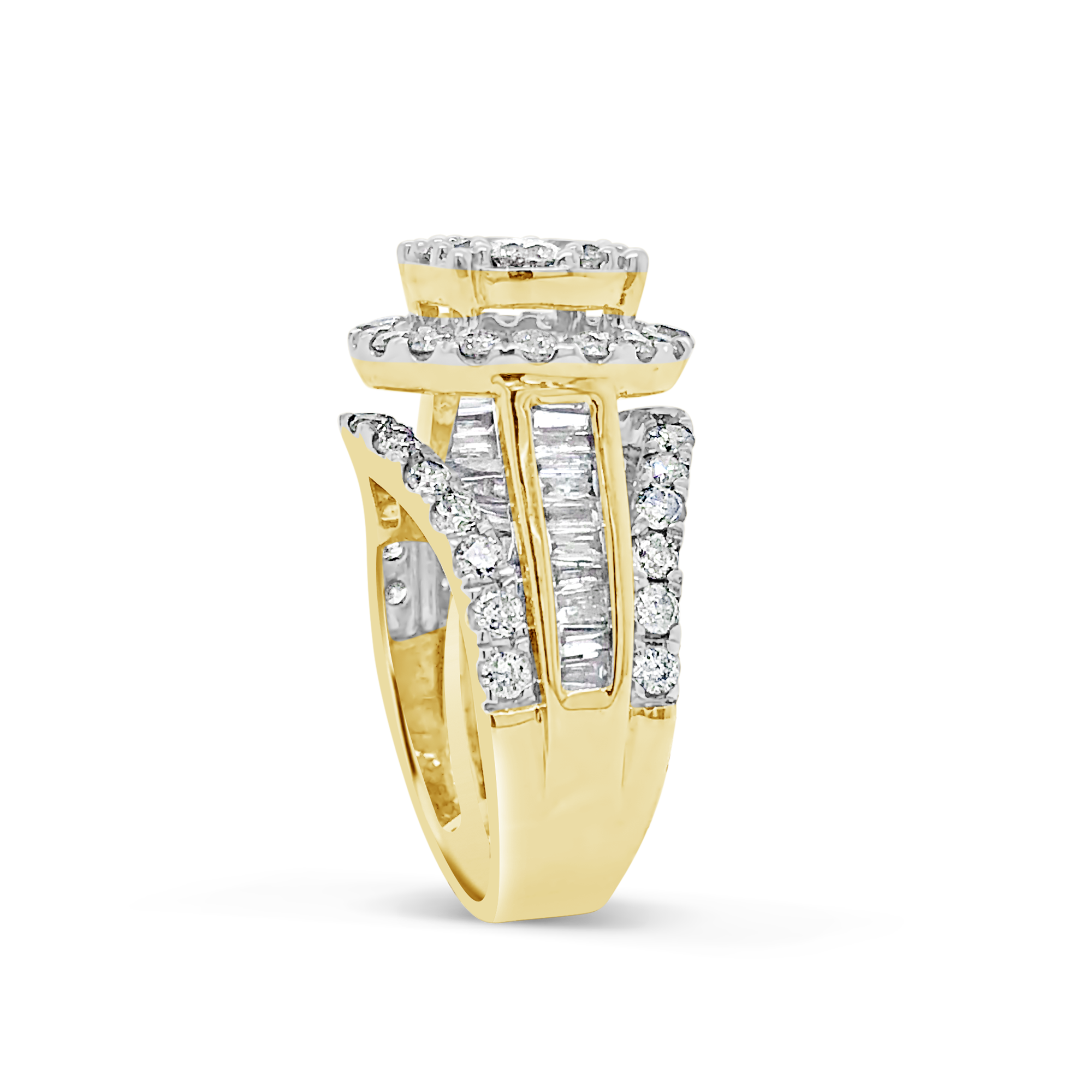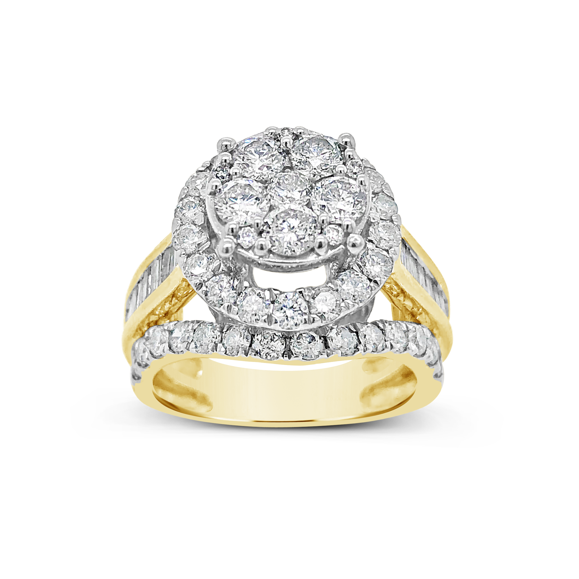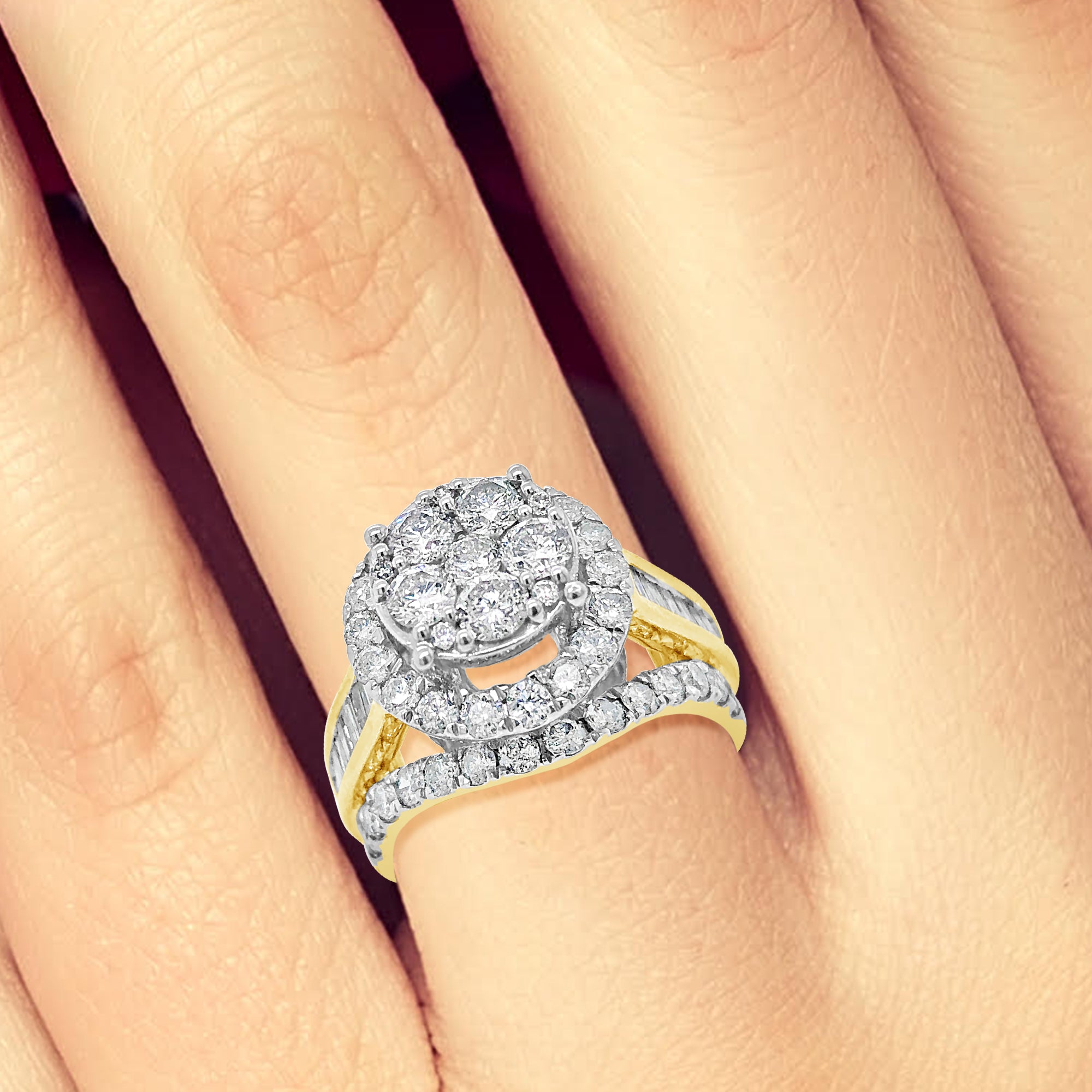The band is crafted from luxurious 14K Yellow Gold, which adds to the overall zeal and richness of the design. The band is also expertly polished to a high shine, ensuring that the ring glimmers and shines beautifully on the finger. Perfect for any occasion, this Diamond Halo Ring is a true testament to the timeless allure of diamonds.