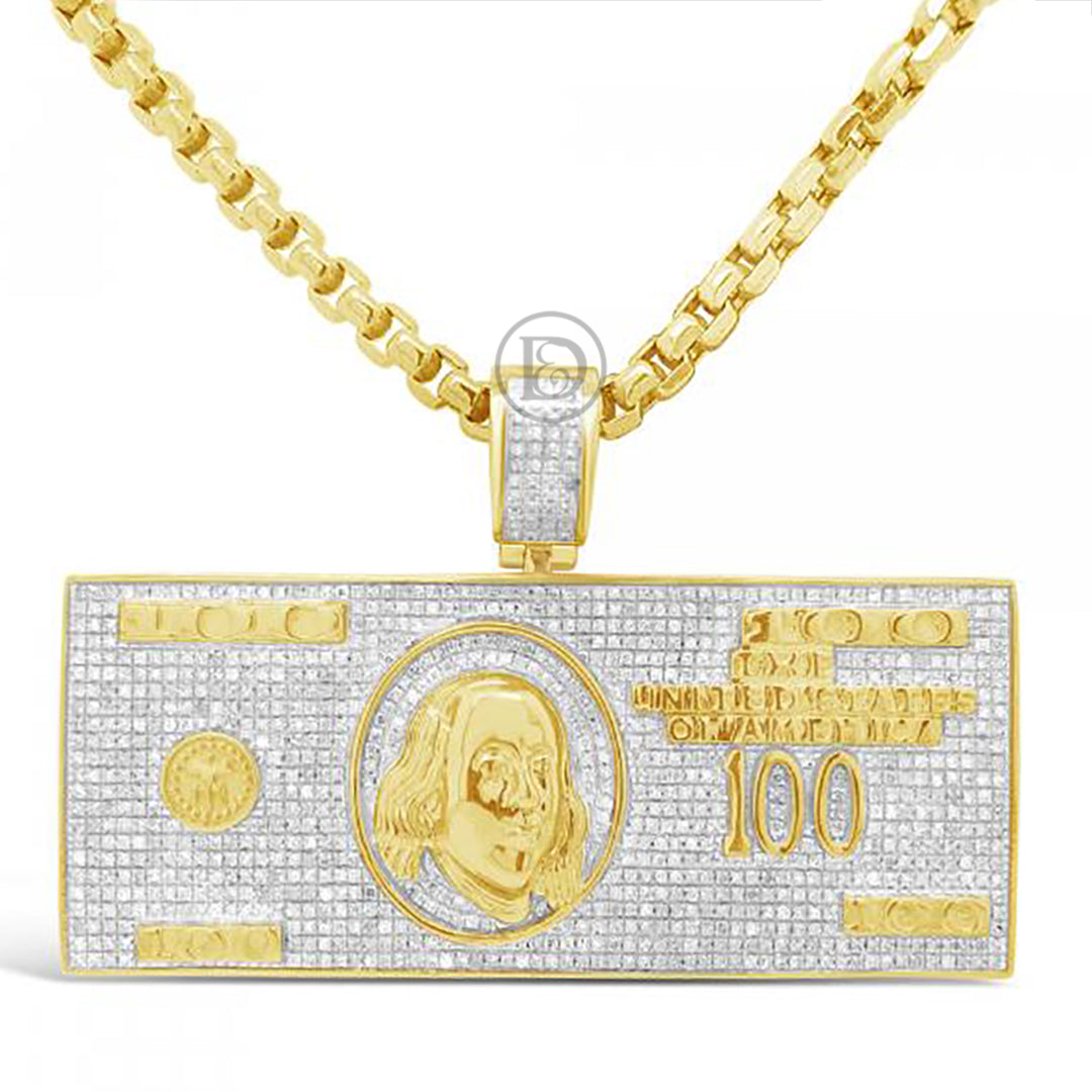 Diamond One Hundred Dollar Bill Pendant 1.86 CTW Round Cut 10K Yellow Gold
