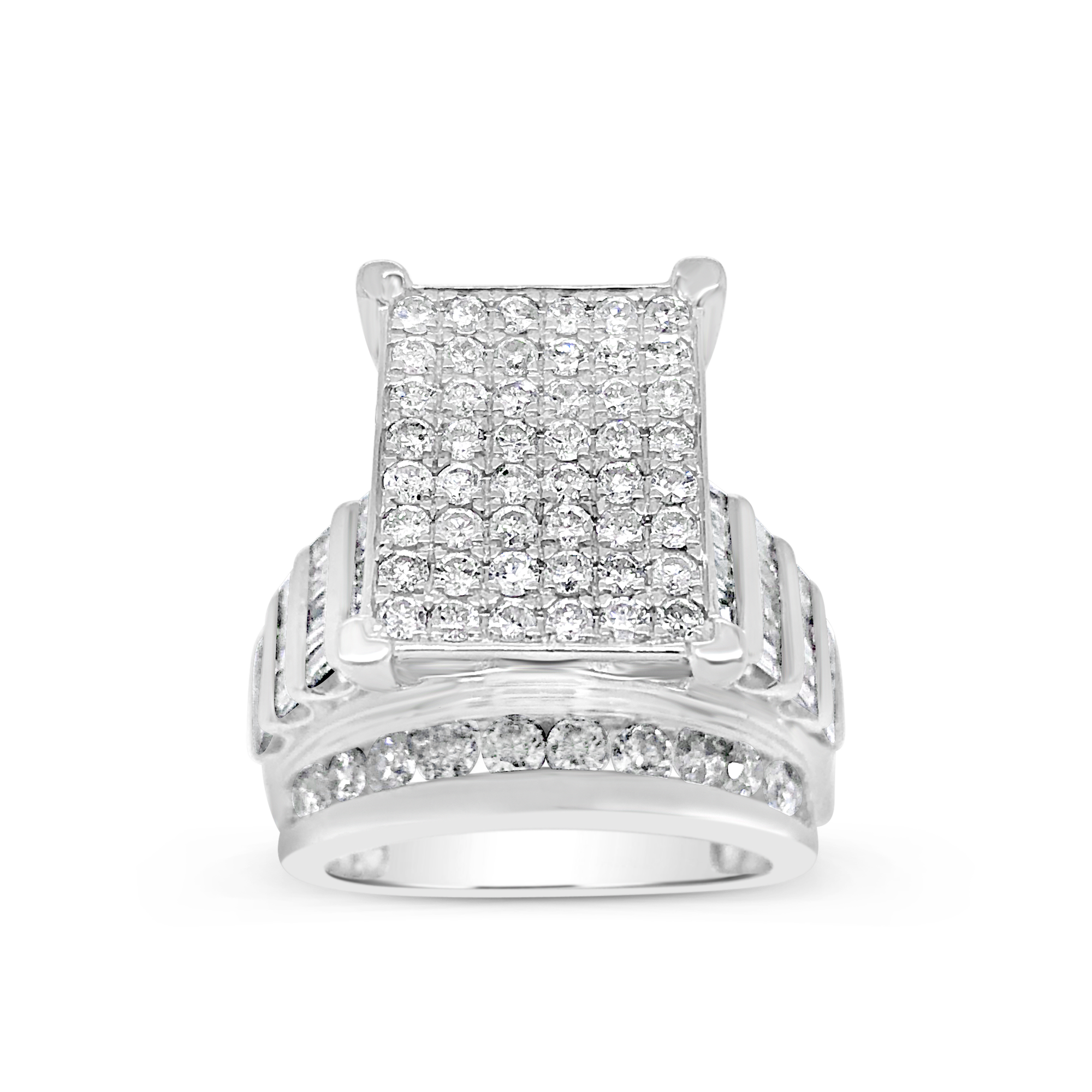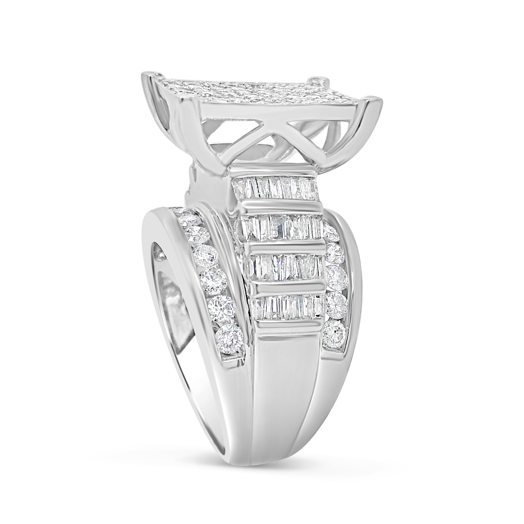 Our Diamond Ring is a glorious piece of jewelry, featuring breathtaking 4.05-carat total weight (CTW) Princess-Cut diamonds surrounded by Baguette and Round-Cut diamonds, all set in a sleek and modern 10K White Gold band. The Baguette and Round-Cut diamonds add a unique and distinctive touch to the design, with their exceptional quality and cut. The 10K White Gold band is modern and elegant, serving to highlight the beauty of the diamonds. Overall, this Diamond Ring is a true masterpiece, showcasing the timeless beauty and sophistication of diamonds, and sure to become a treasured piece in your jewelry collection.
