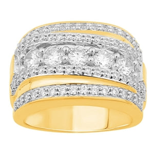 Enjoy this luxurious piece of jewelry that will attract attention with 3 CT round/baguette diamonds. This ring is expertly made from 10K yellow gold and has a row of round and baguette diamonds that shimmer wonderfully in the light.